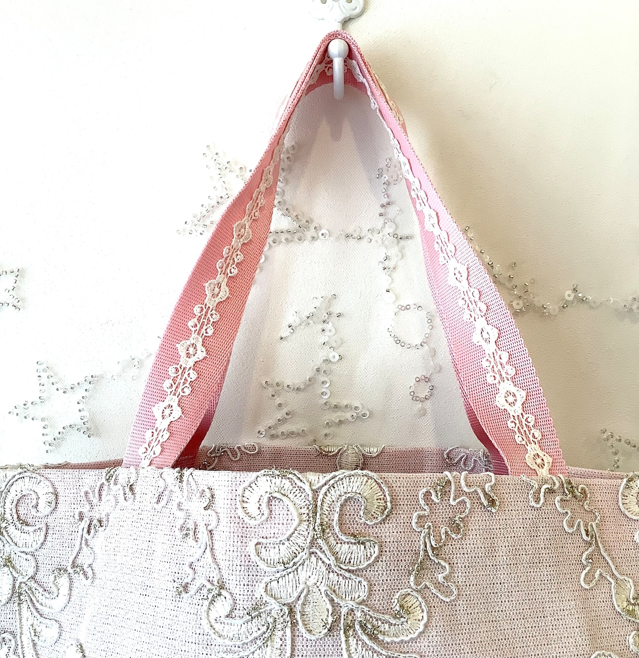 手作りの温かみが感じられるマーケットバッグ、シャーベットカラーのご紹介です。トルコのカーテンレースを使用しており、一つ一つ手作業で作られたアップサイクル商品です。お買い物や旅行など荷物が多い方にもぴったりの大きなバッグで、裏地もしっかりついています。内側にはかわいらしいレースポケットも付いていて、小物の収納も便利です。持ち手は長めに設計されており、肩にもかけられます。持ち手にもレースがあしらわれているので、ファッションアイテムとしてもおしゃれに活躍します。ぜひお気に入りのカーテンレースマーケットバッグを手に入れて、おしゃれなスタイリングを楽しんでみてください。