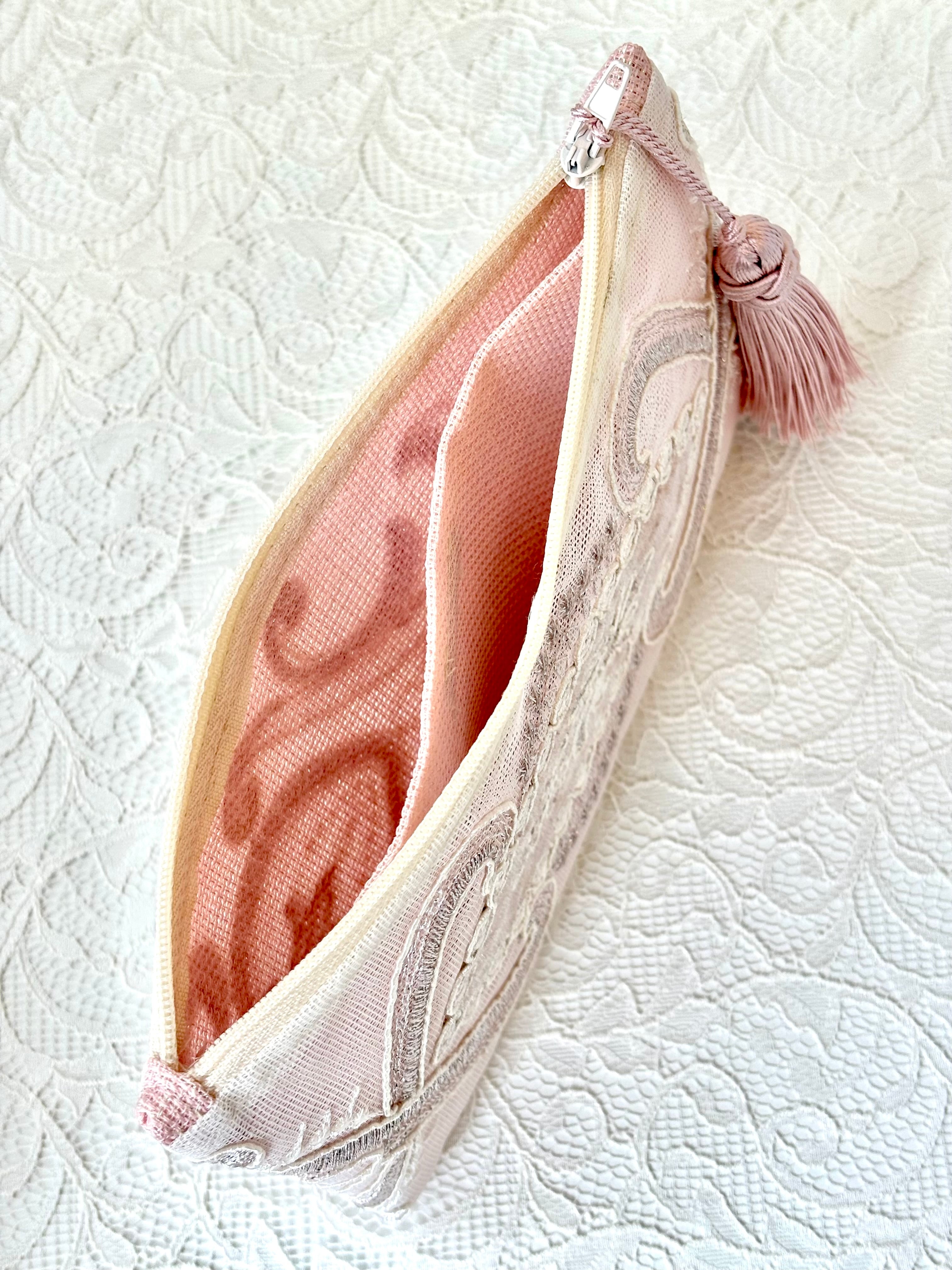 デザイン性と機能性を兼ね備えたこのポーチは、トルコの伝統的なカーテンレースを使った、アップサイクル商品です。