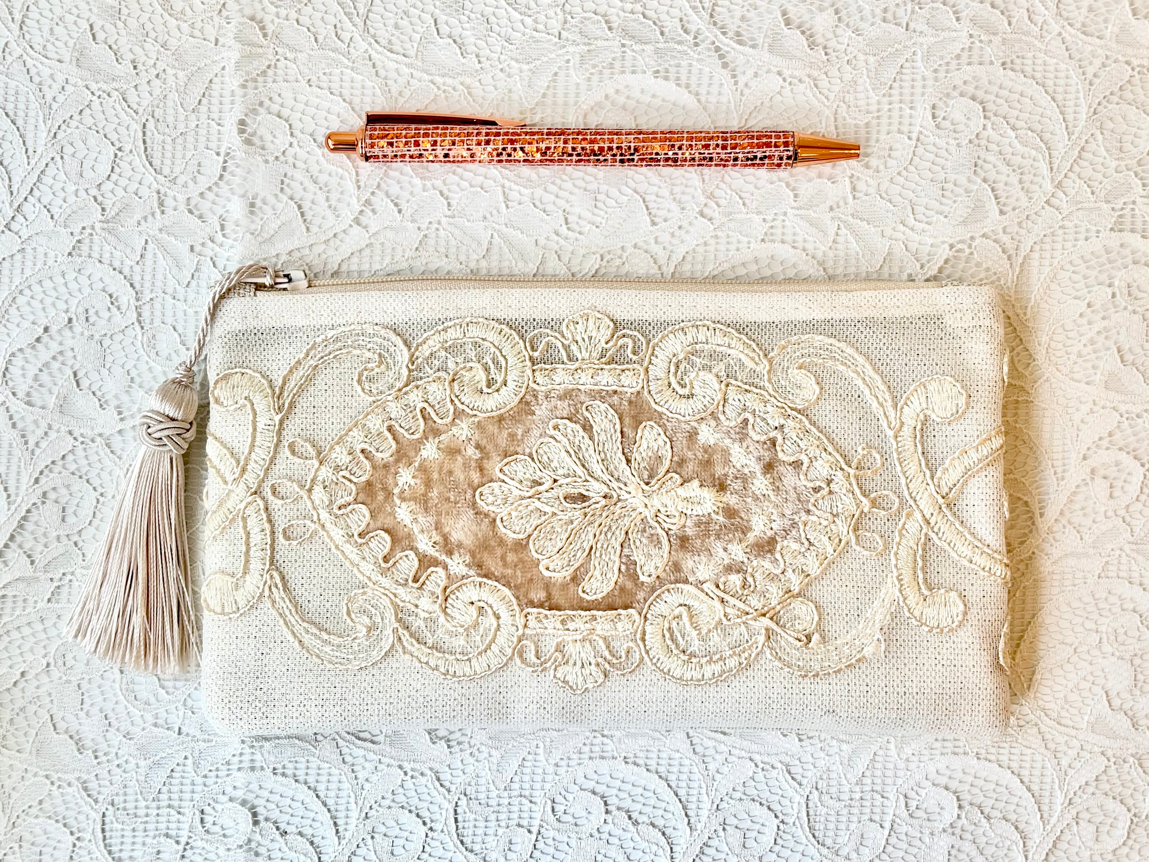 デザイン性と機能性を兼ね備えたこのポーチは、トルコの伝統的なカーテンレースを使った、アップサイクル商品です。