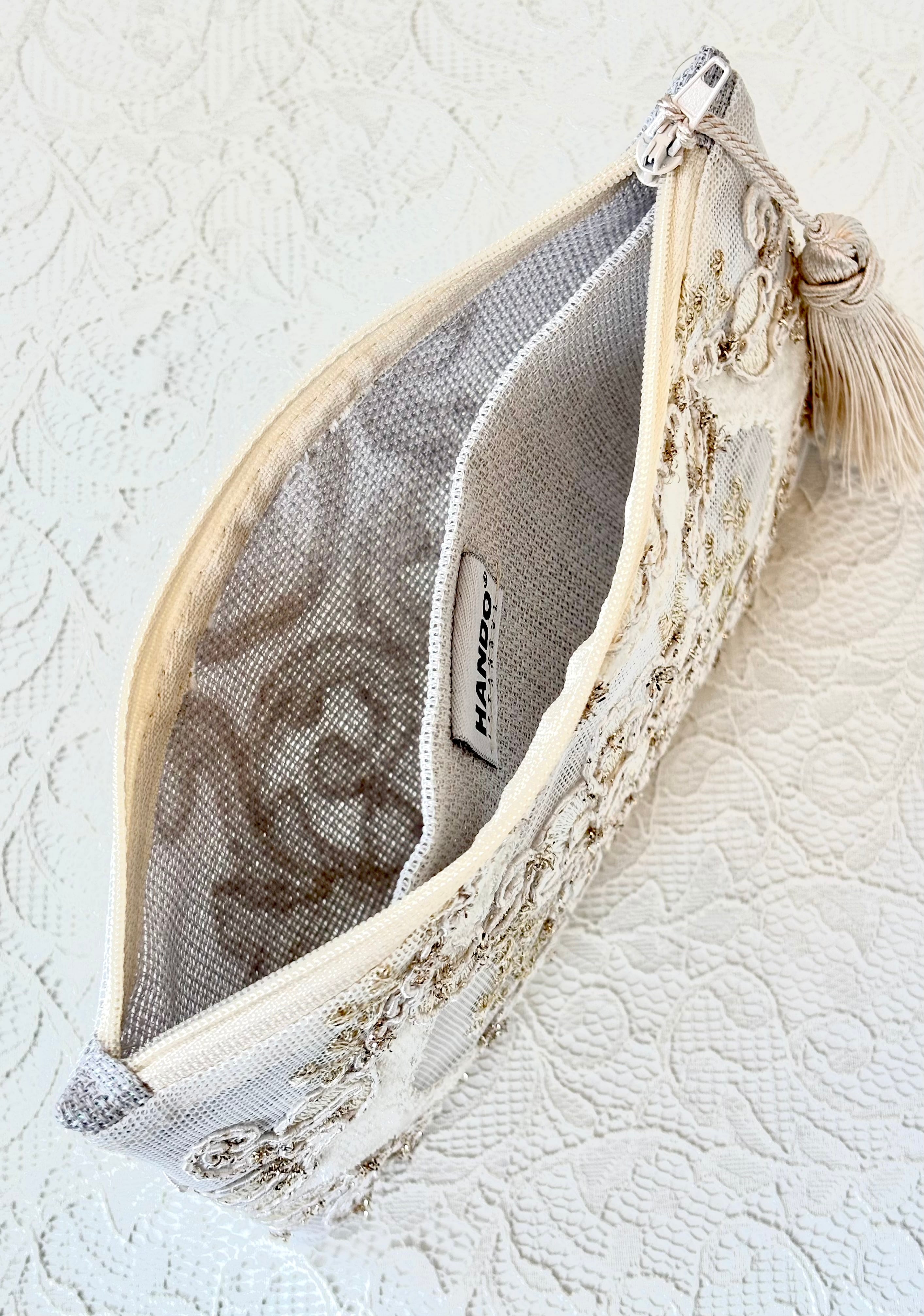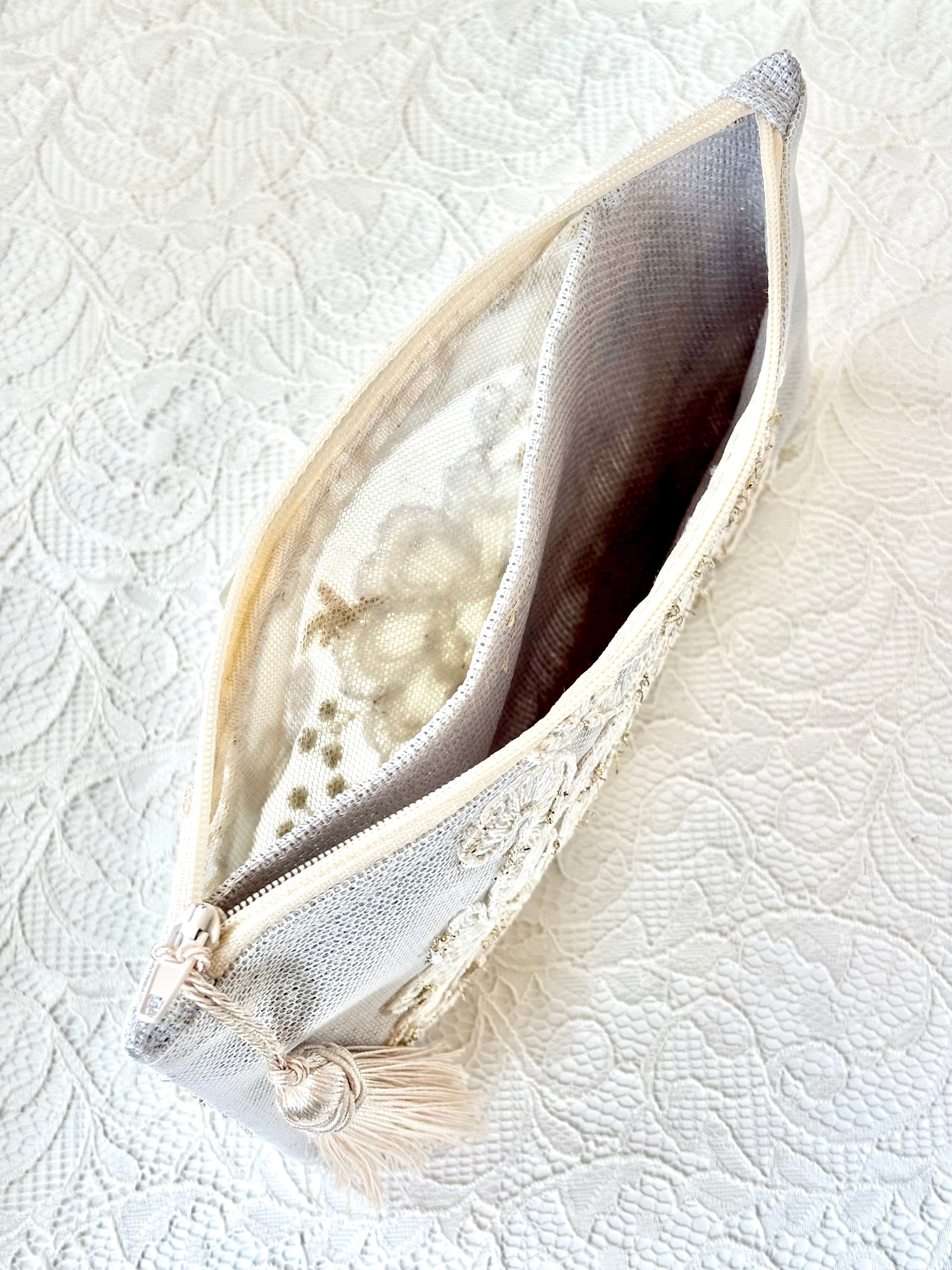 デザイン性と機能性を兼ね備えたこのポーチは、トルコの伝統的なカーテンレースを使った、アップサイクル商品です。