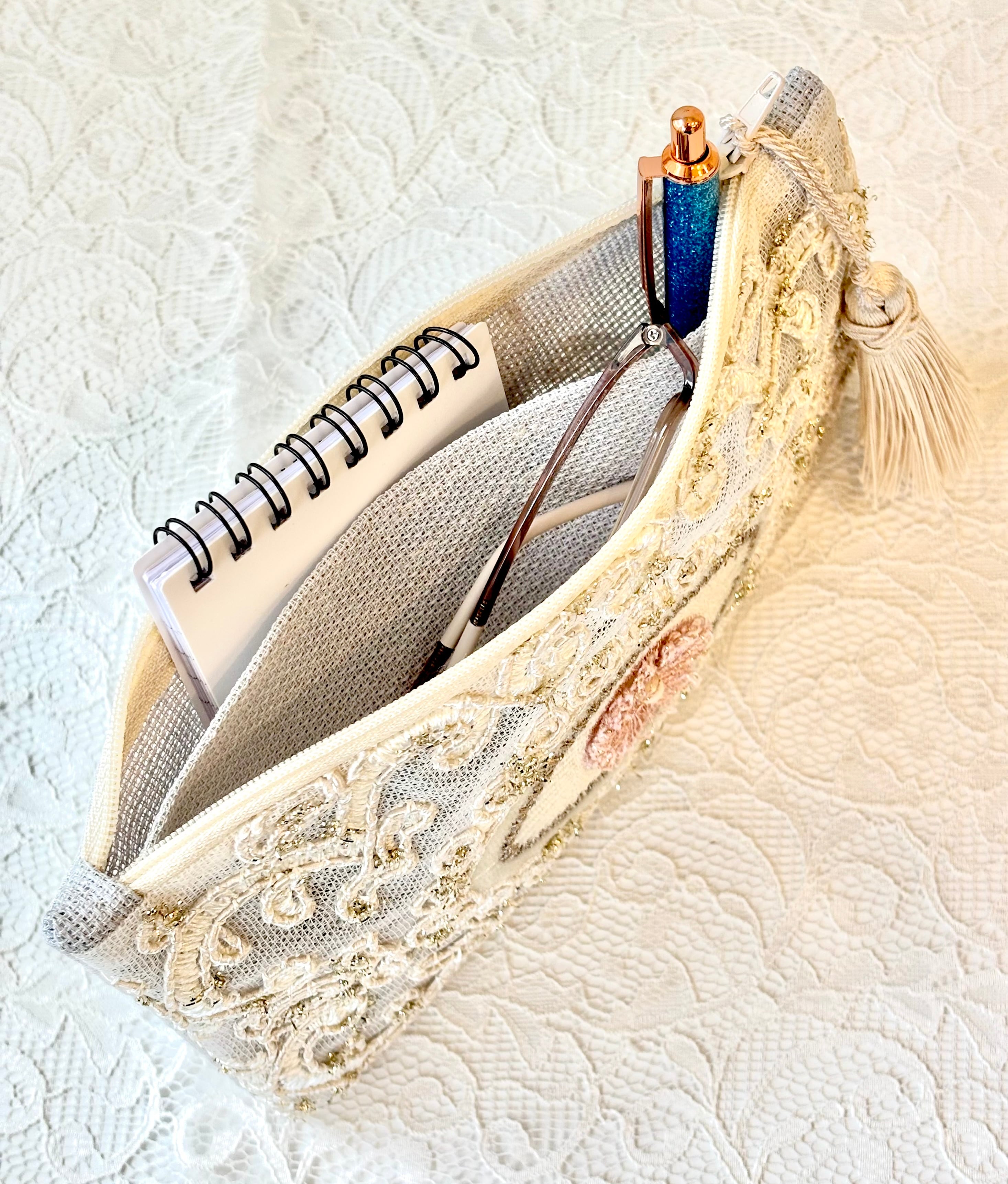 デザイン性と機能性を兼ね備えたこのポーチは、トルコの伝統的なカーテンレースを使った、アップサイクル商品です。