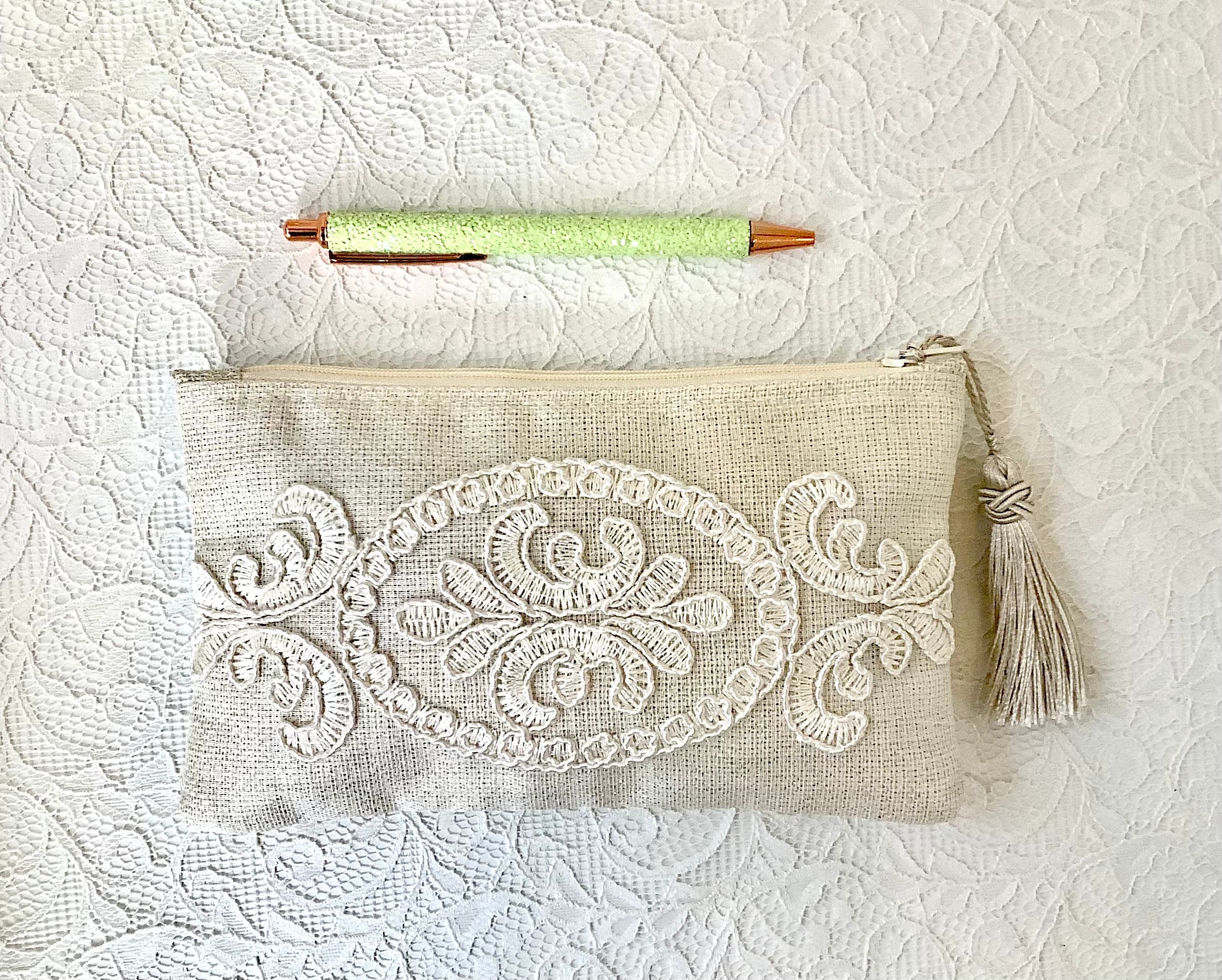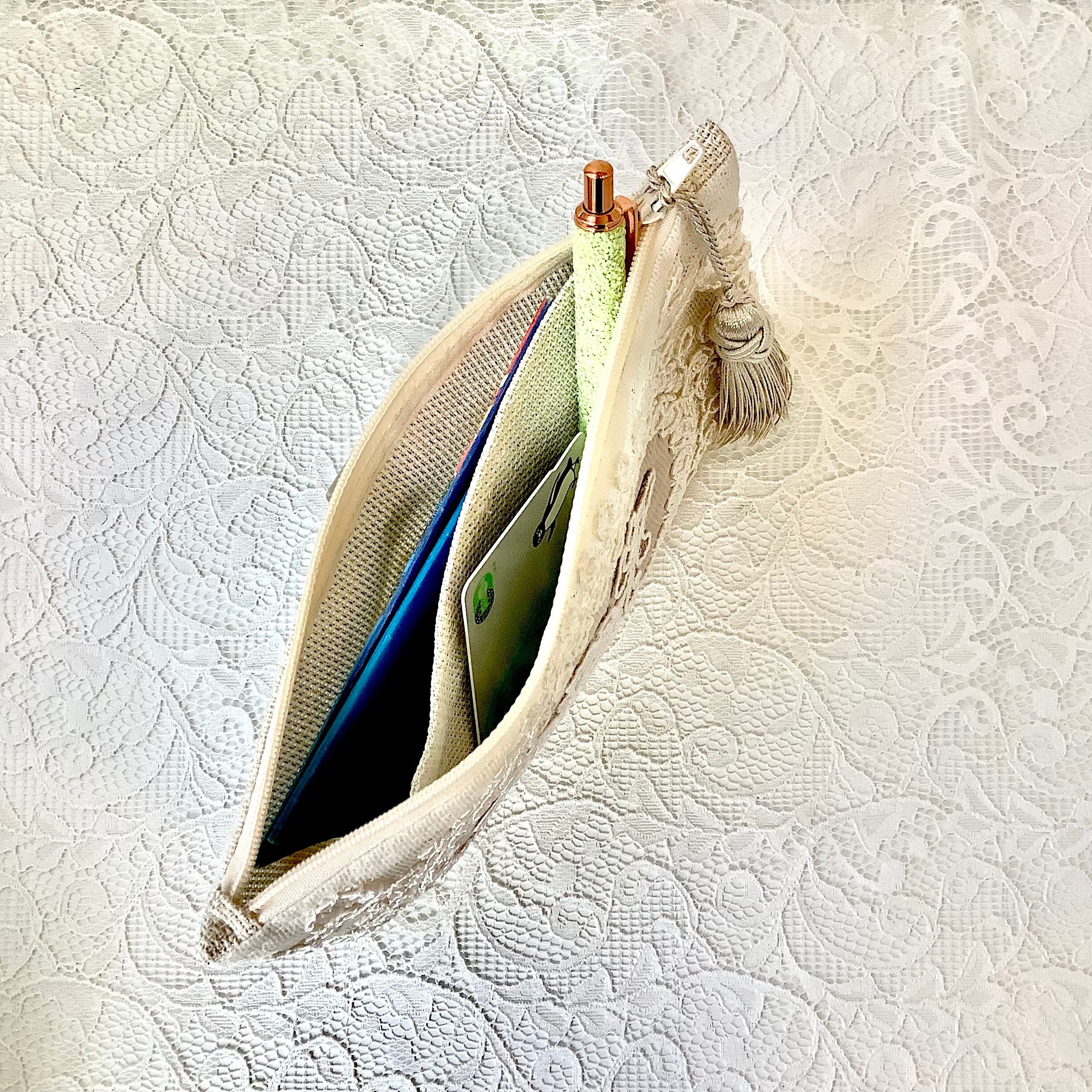 デザイン性と機能性を兼ね備えたこのポーチは、トルコの伝統的なカーテンレースを使った、アップサイクル商品です。