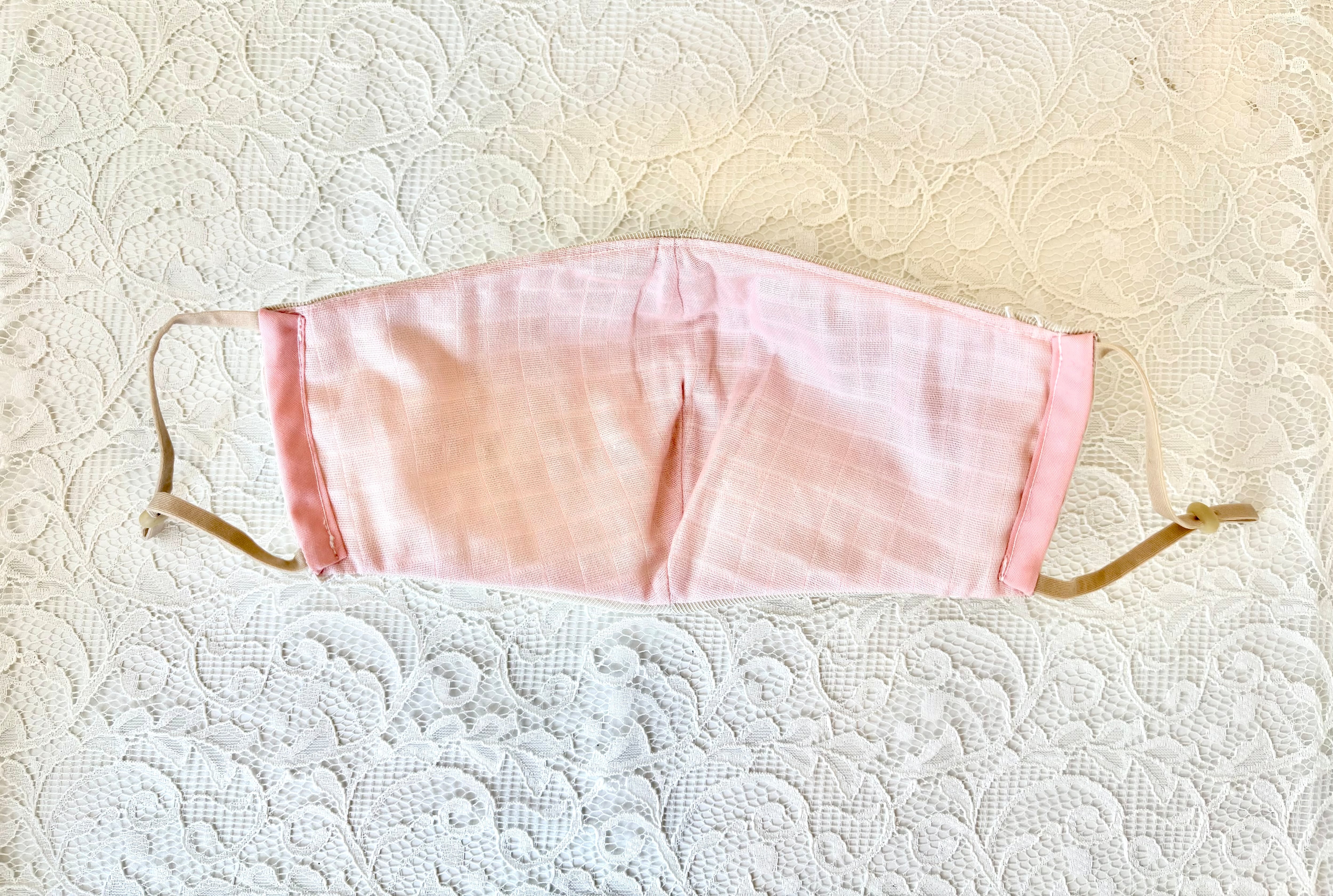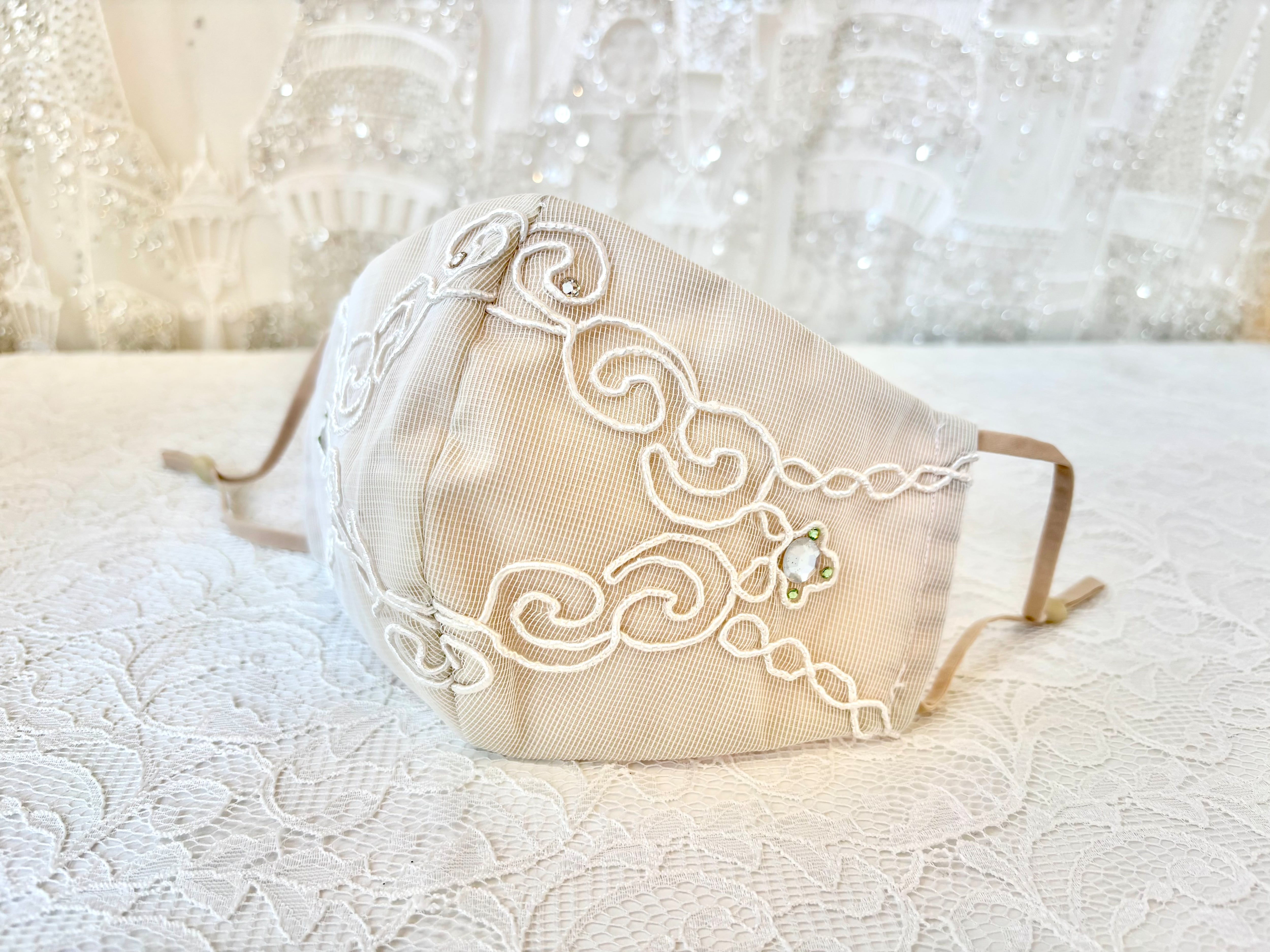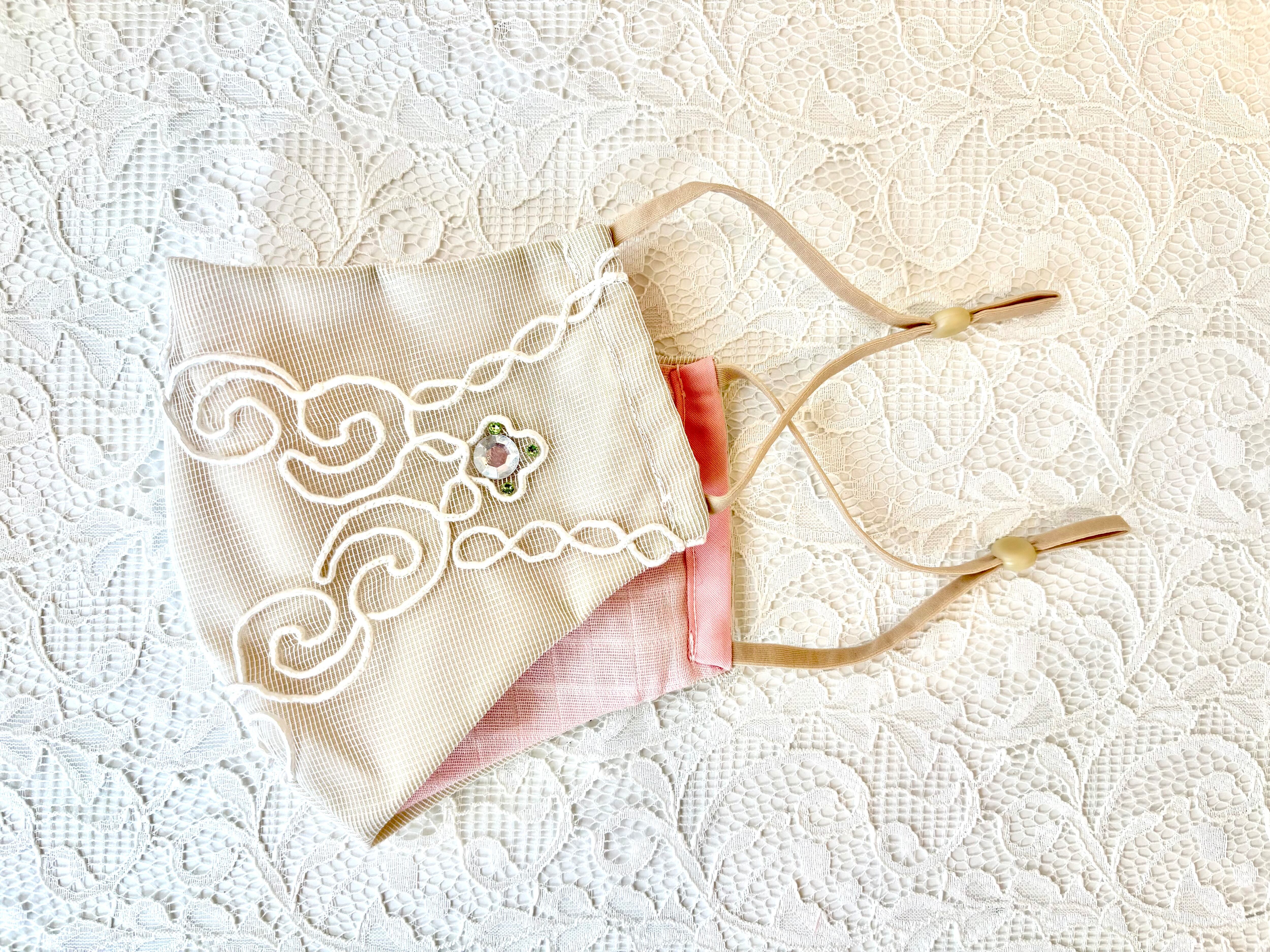 ガーゼにトルコの高級レースを重ねた、かわいらしいデザインのクレンゼマスクです。