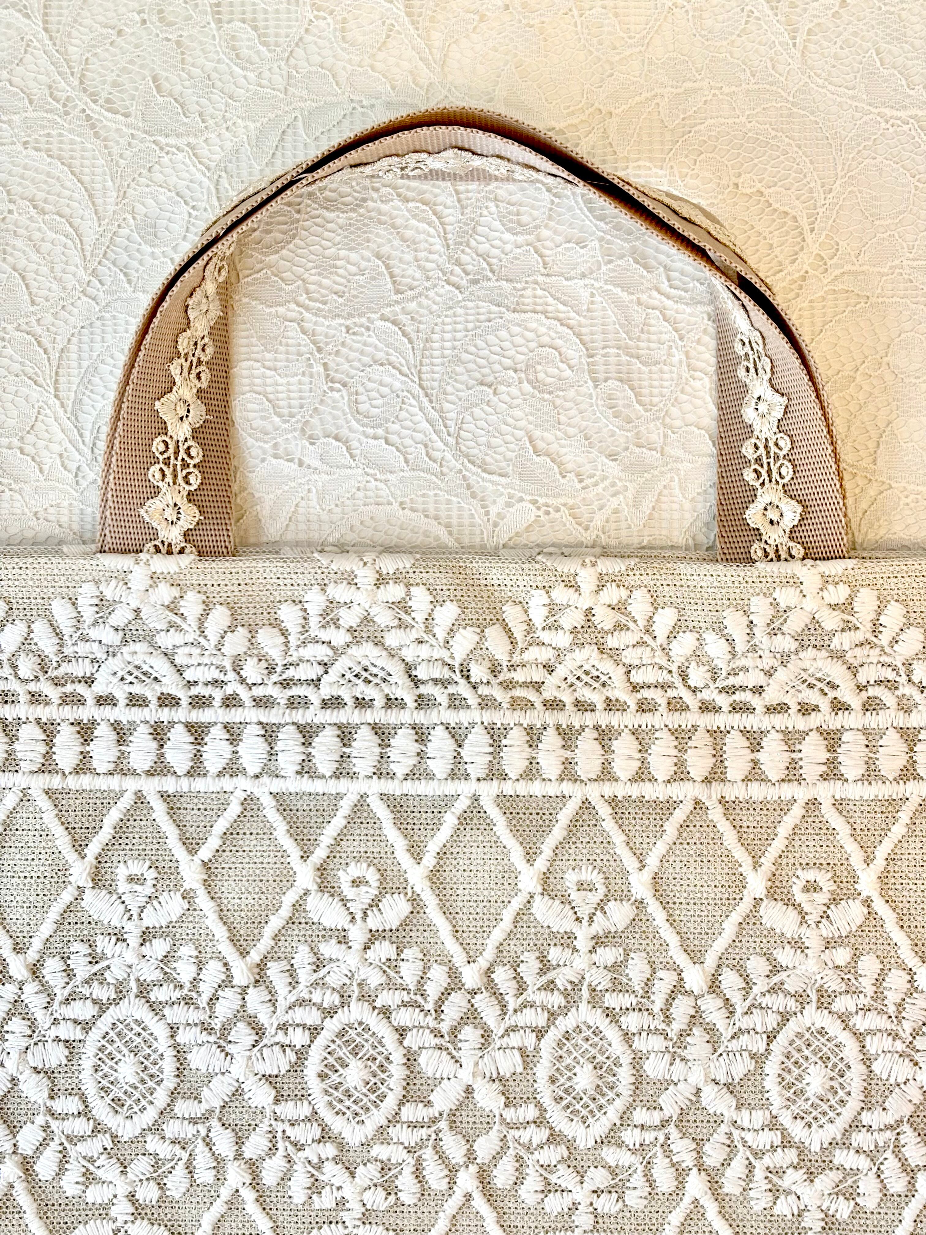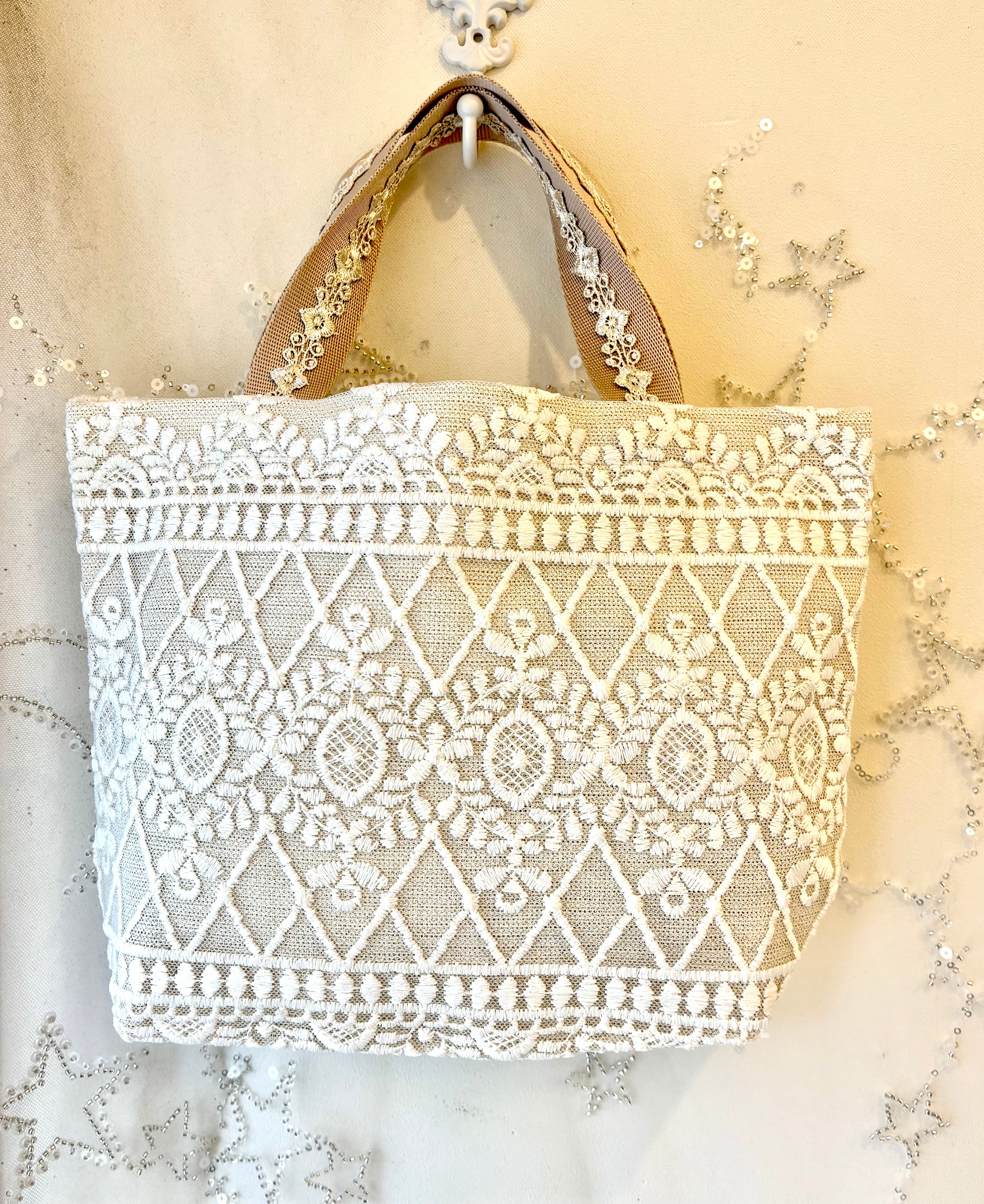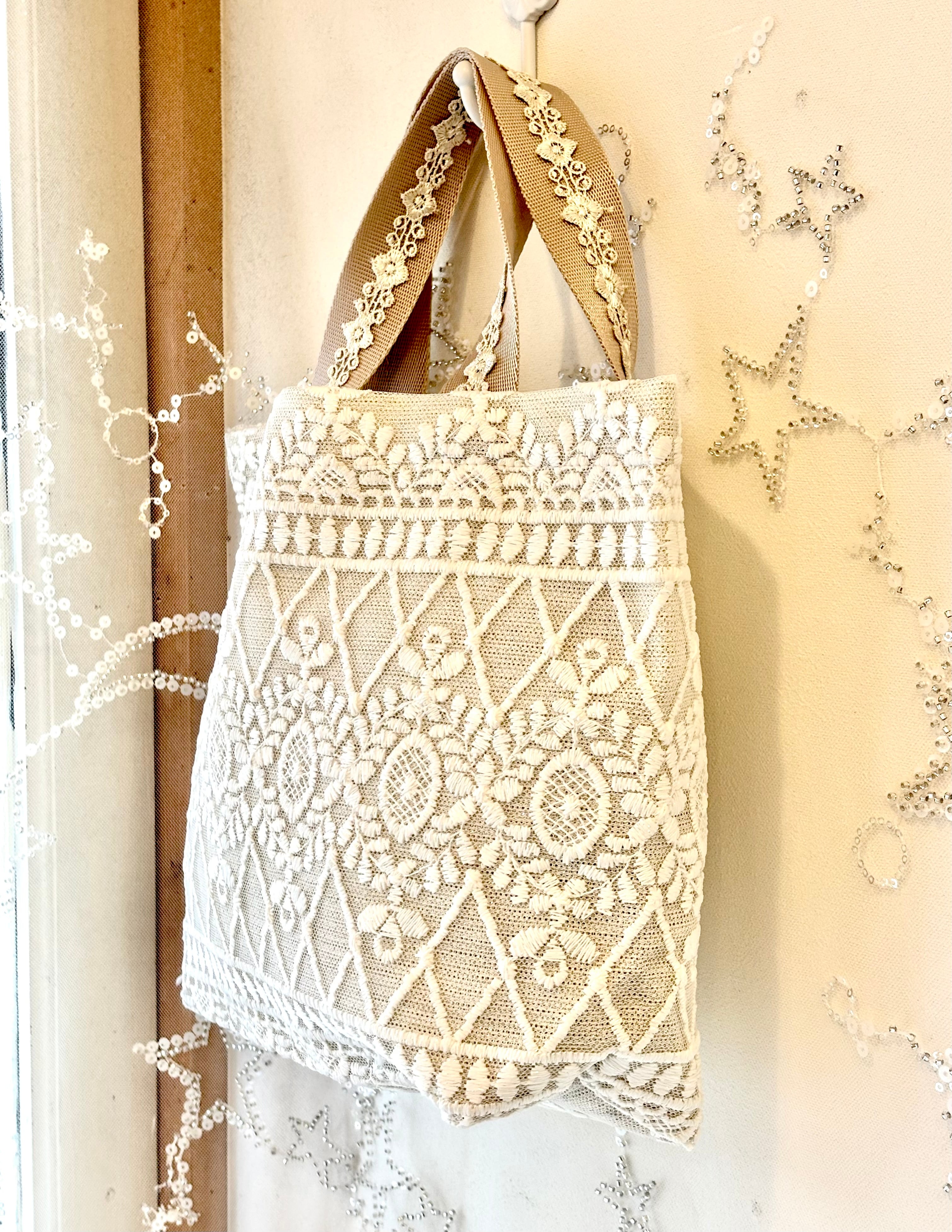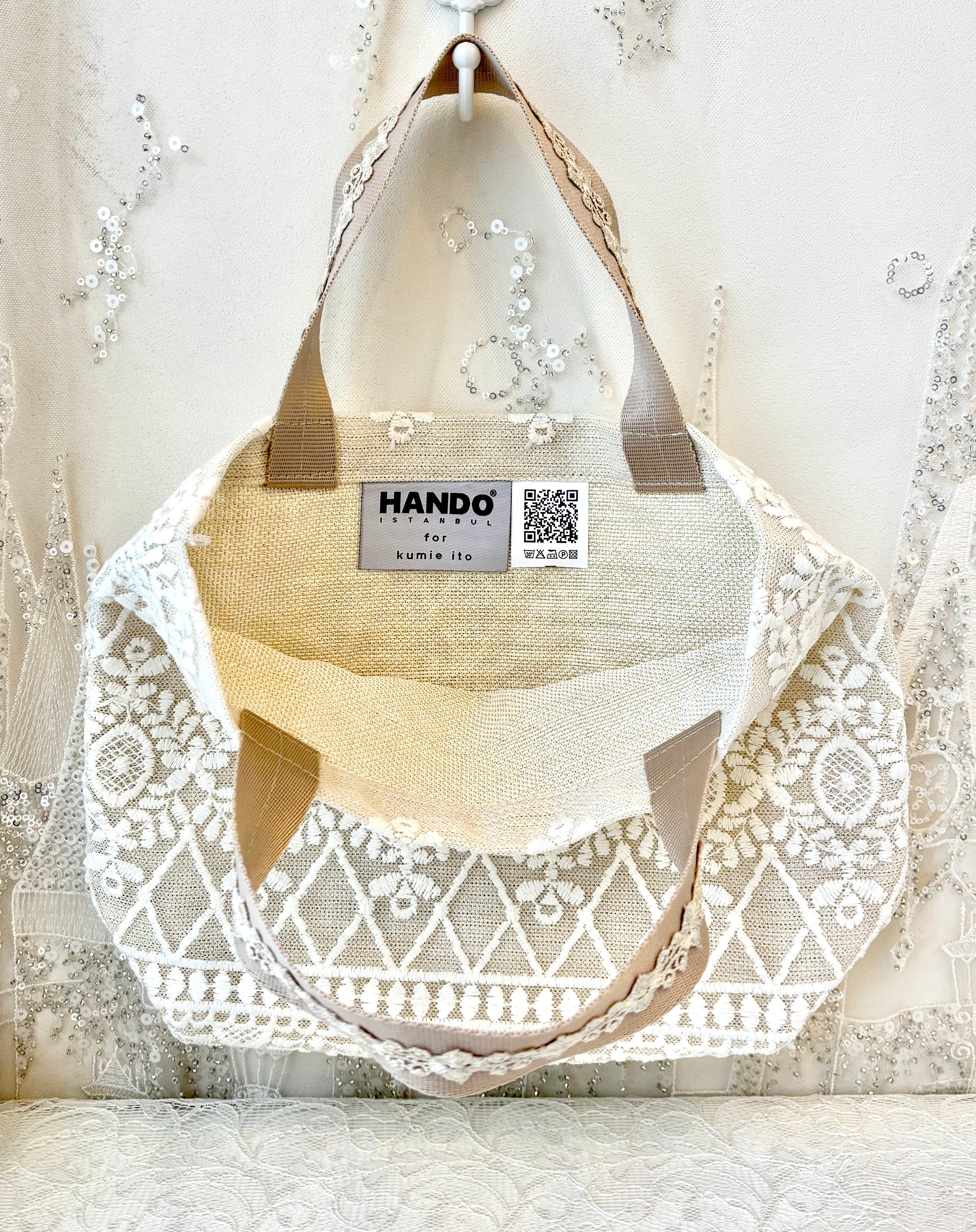 キャサリンは、トルコの高級カーテンレースを使用して作られたアップサイクル商品です。生地にレースを重ねているため、非常に丈夫で長持ちします。底マチ部分にもたっぷりとレースが使用されており、エレガントなデザインが特徴です。さらに、レースの柄は全て異なるため、あなただけのオリジナルバッグを手に入れることができます。
