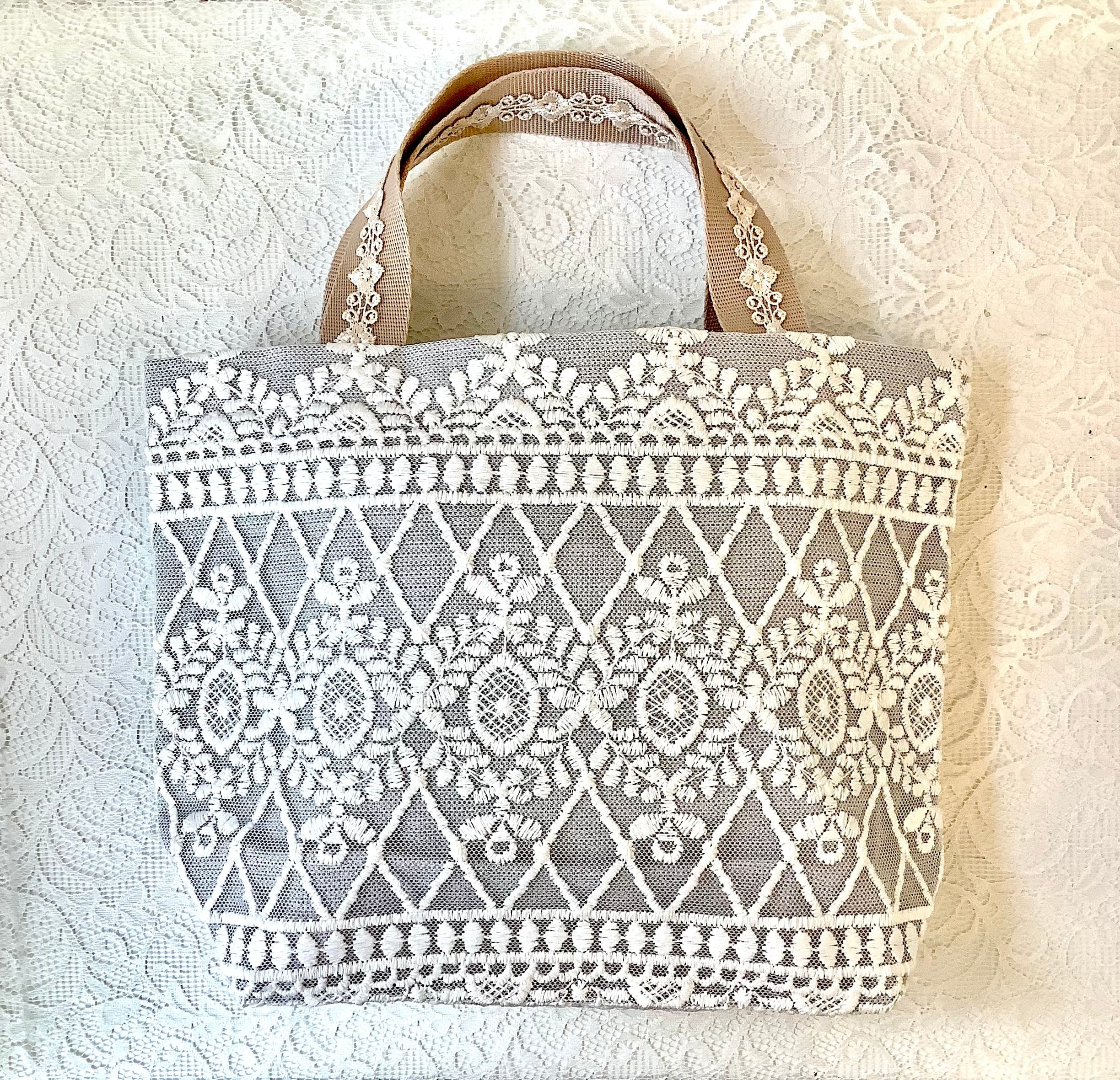 生地にレースを重ねているため、非常に丈夫で長持ちし、底マチ部分にもたっぷりとレースが使用されており、エレガントなデザインが特徴です。