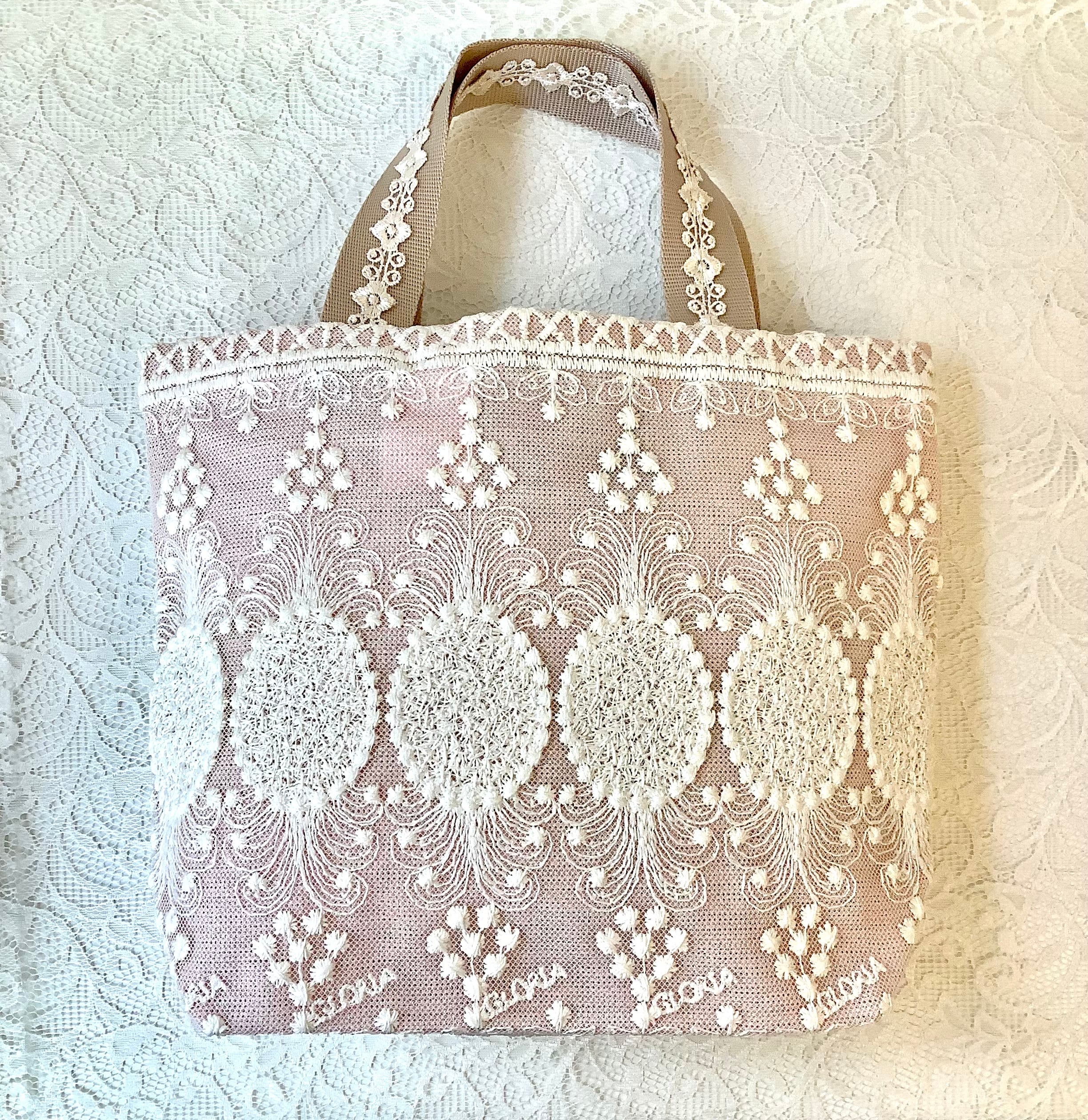 生地にレースを重ねているため、非常に丈夫で長持ちし、底マチ部分にもたっぷりとレースが使用されており、エレガントなデザインが特徴です。