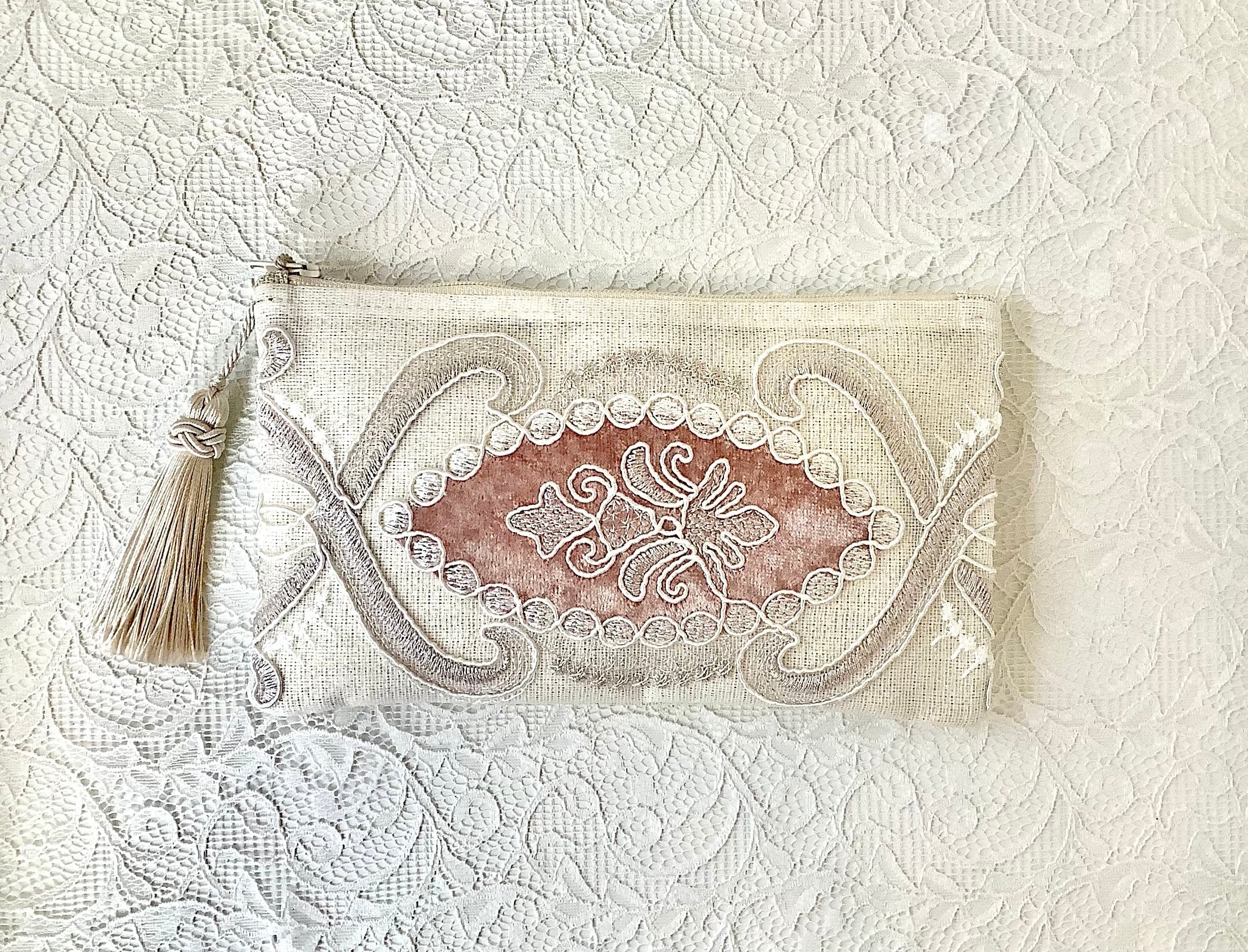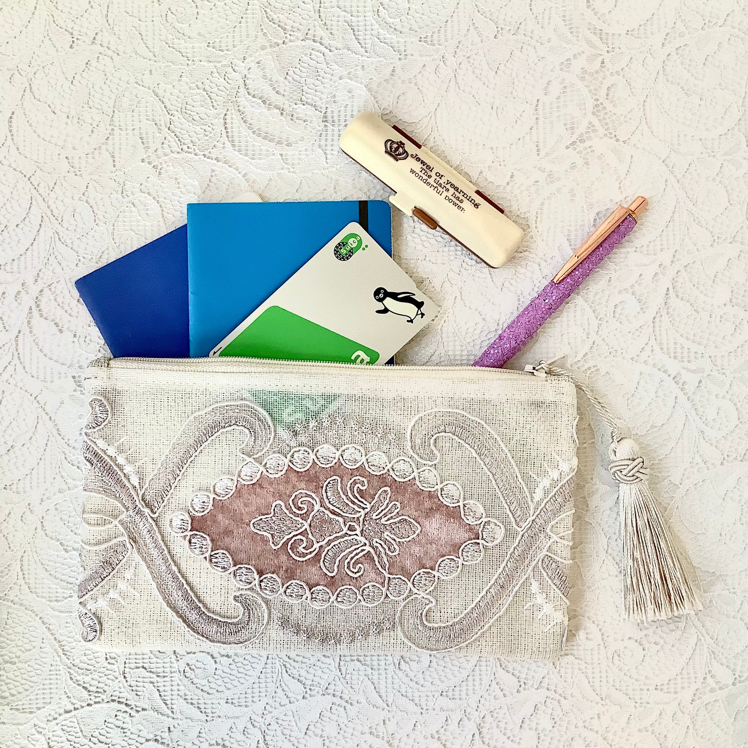 デザイン性と機能性を兼ね備えたこのポーチは、トルコの伝統的なカーテンレースを使った、アップサイクル商品です。
