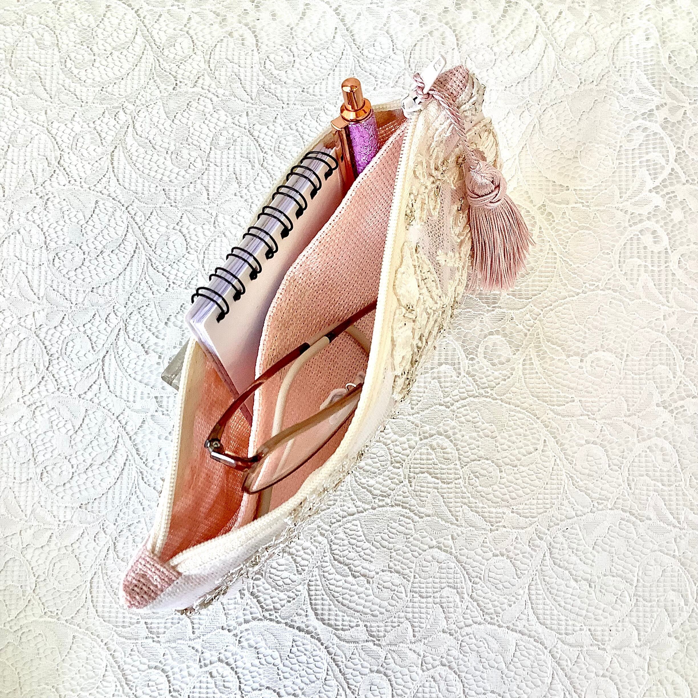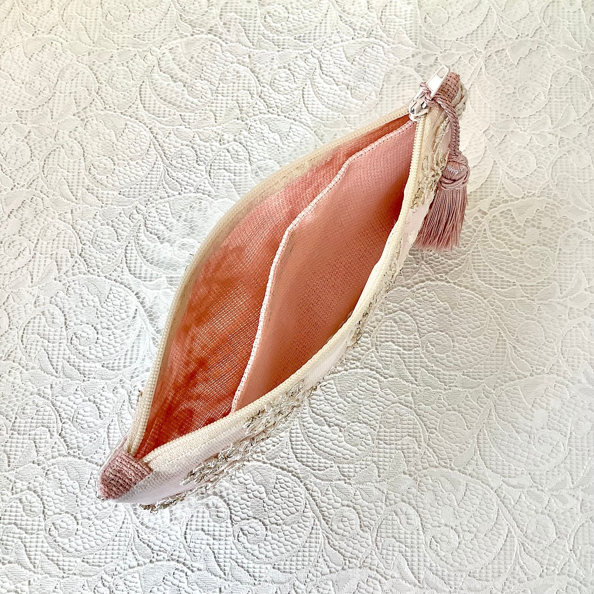 デザイン性と機能性を兼ね備えたこのポーチは、トルコの伝統的なカーテンレースを使った、アップサイクル商品です。