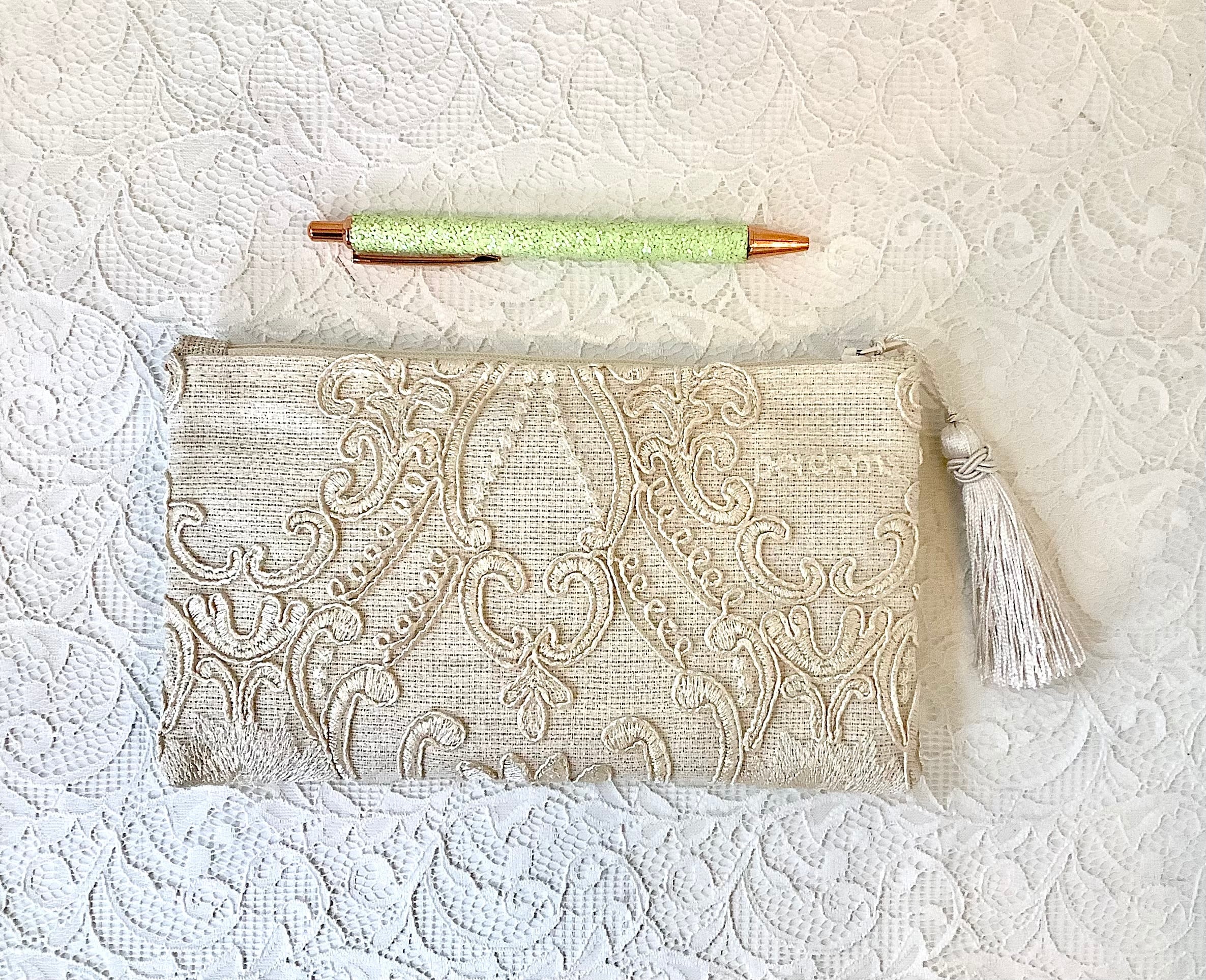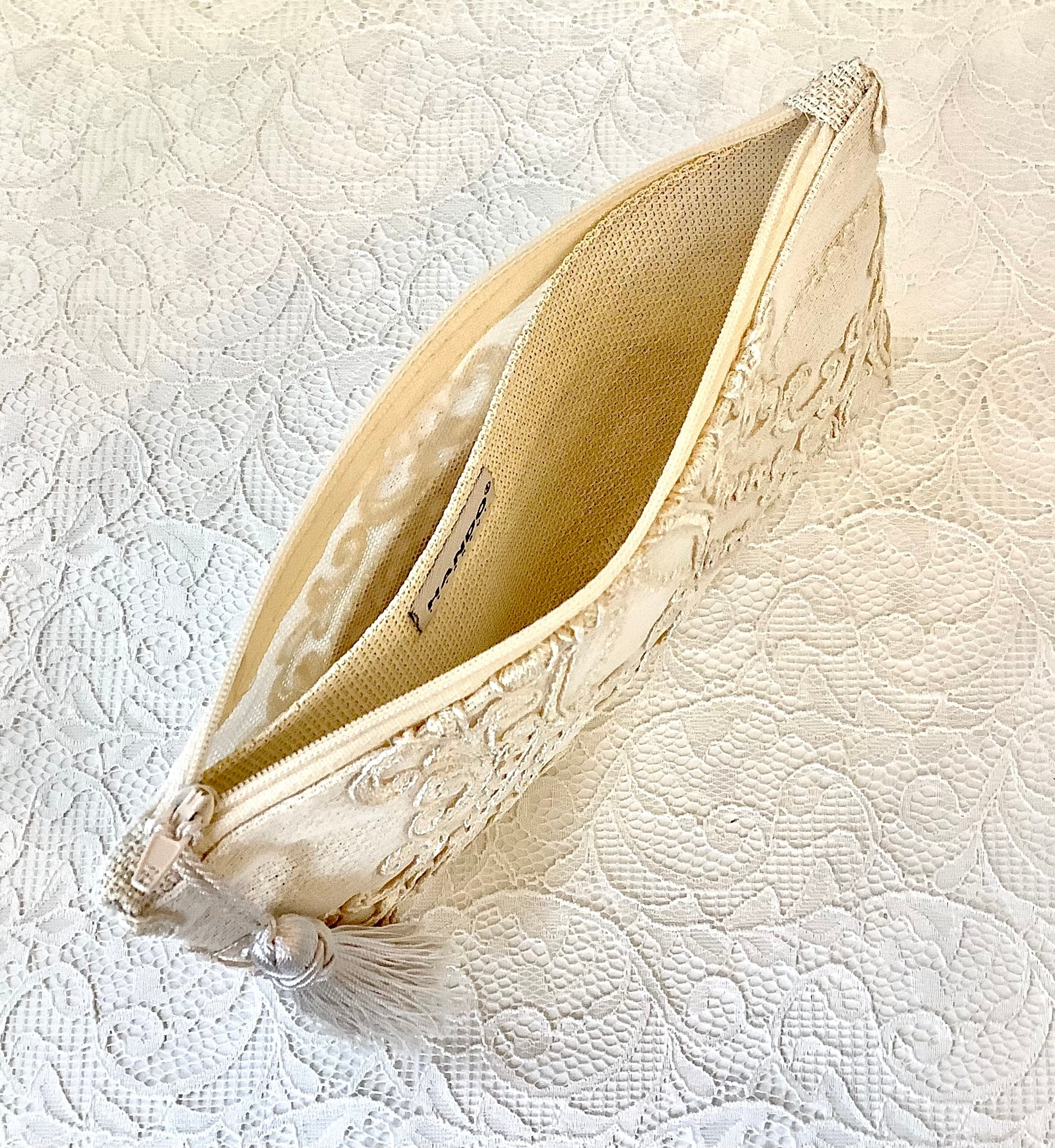 デザイン性と機能性を兼ね備えたこのポーチは、トルコの伝統的なカーテンレースを使った、アップサイクル商品です。