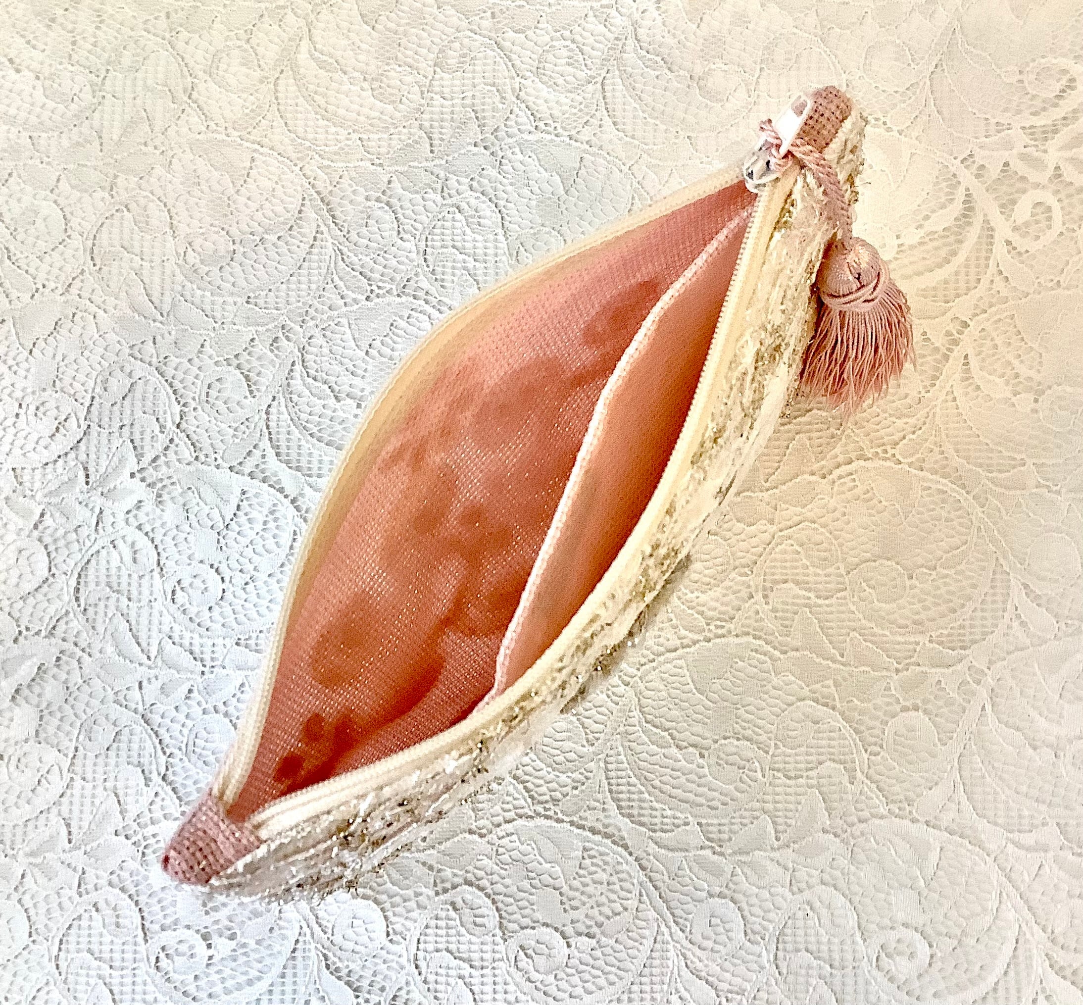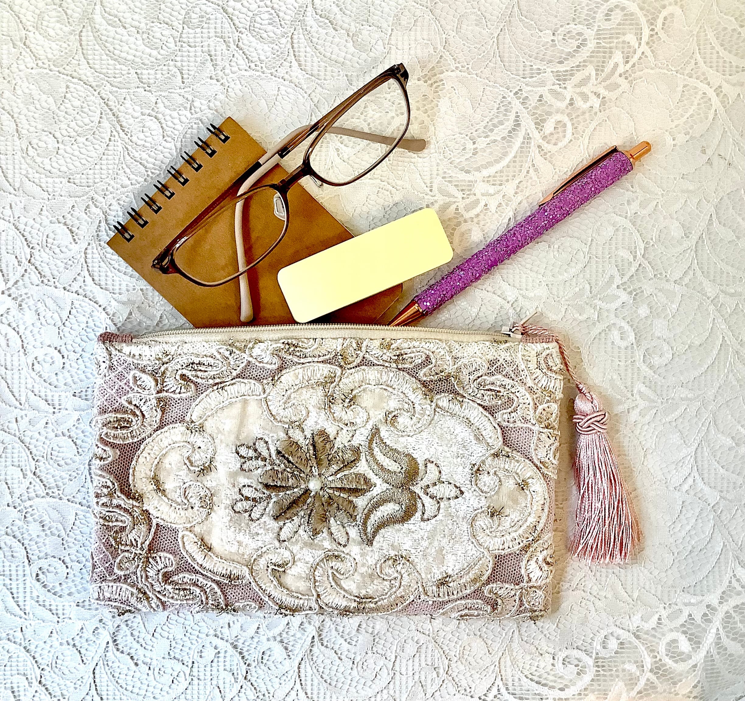 デザイン性と機能性を兼ね備えたこのポーチは、トルコの伝統的なカーテンレースを使った、アップサイクル商品です。