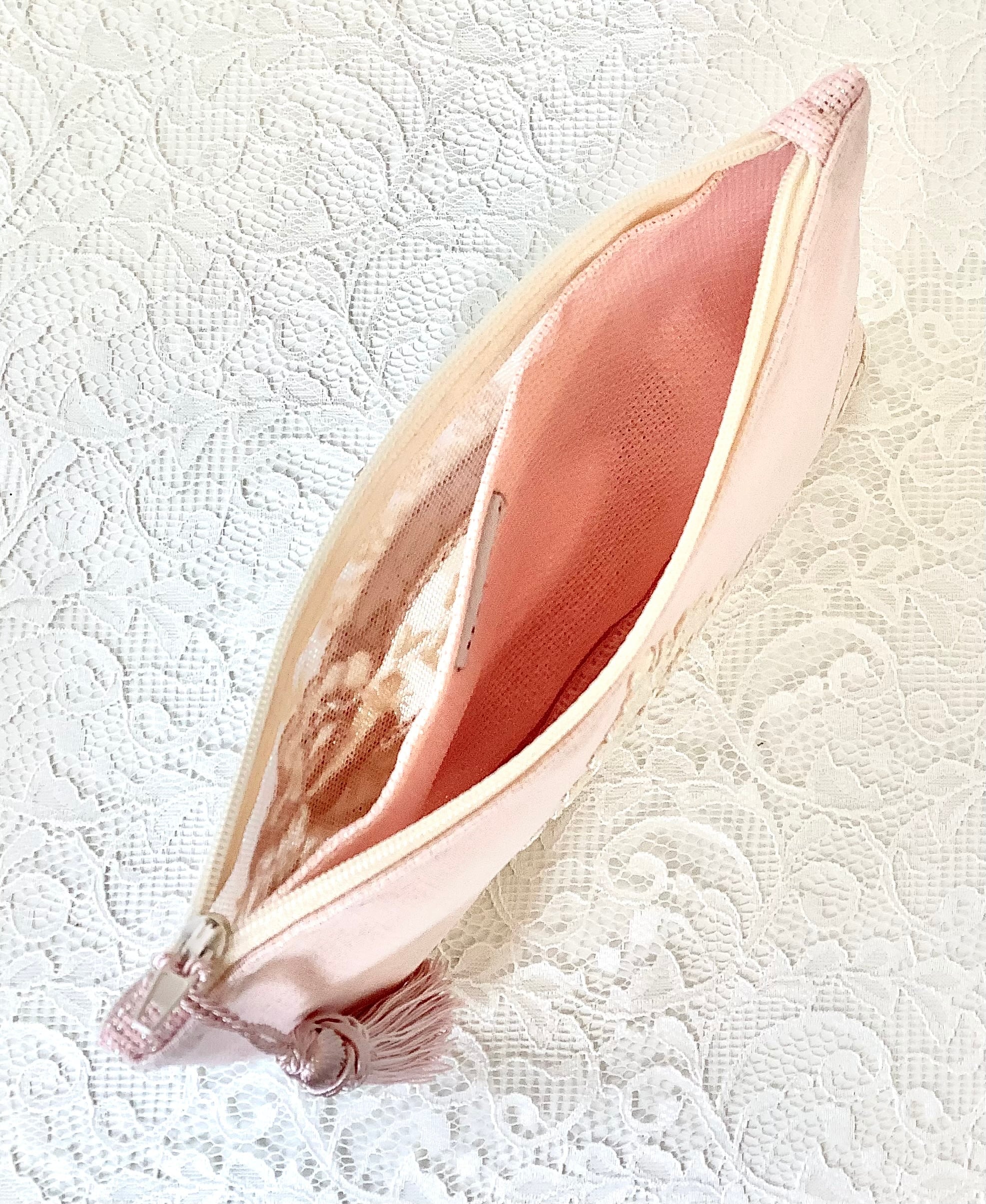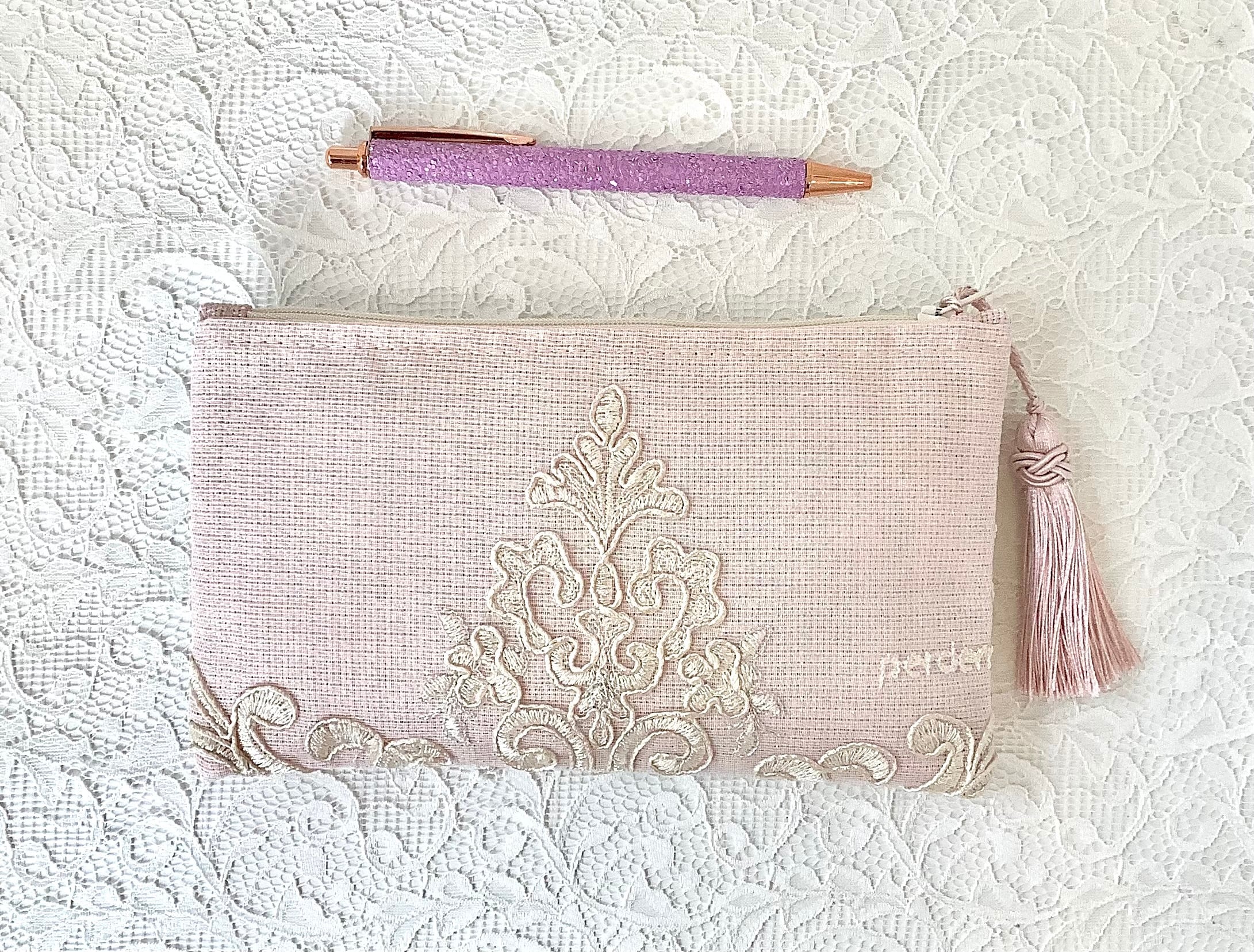 デザイン性と機能性を兼ね備えたこのポーチは、トルコの伝統的なカーテンレースを使った、アップサイクル商品です。