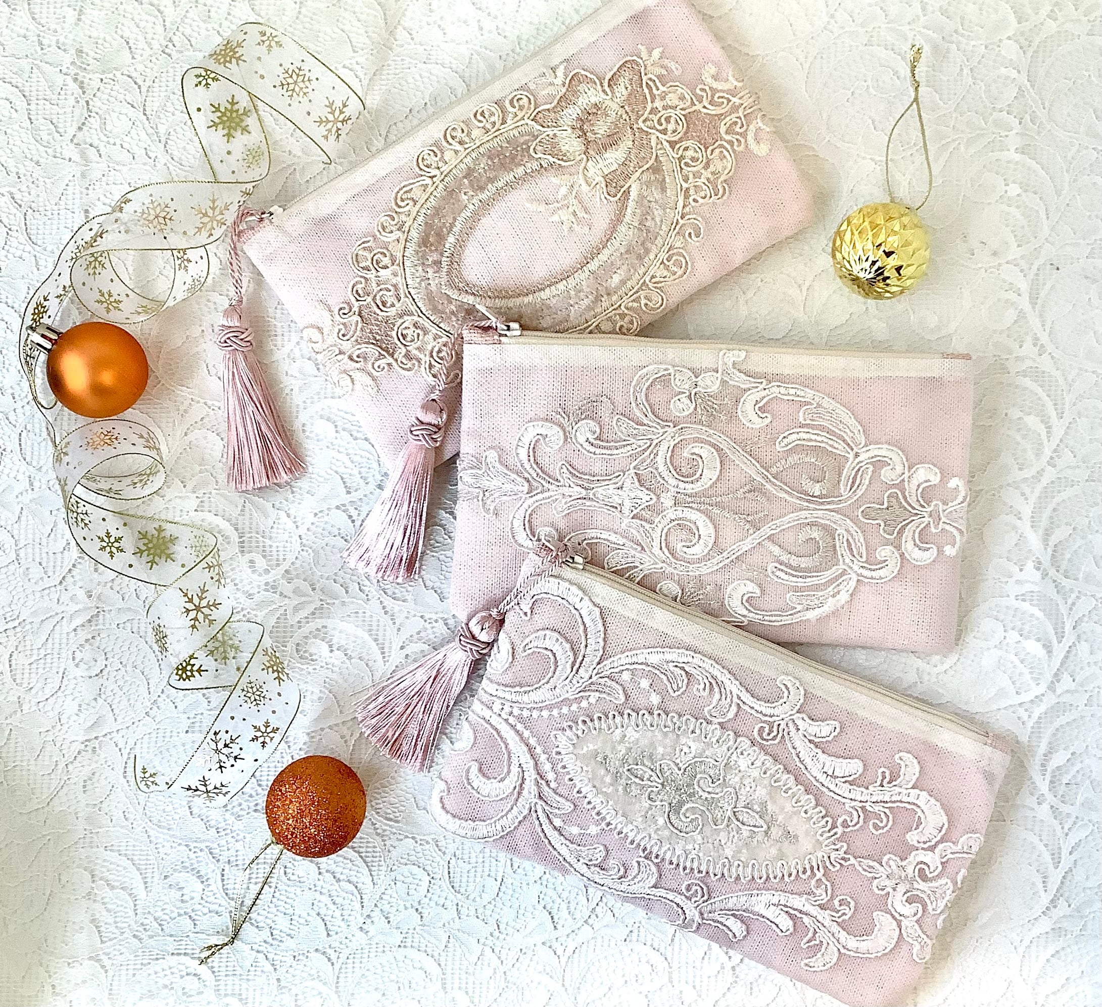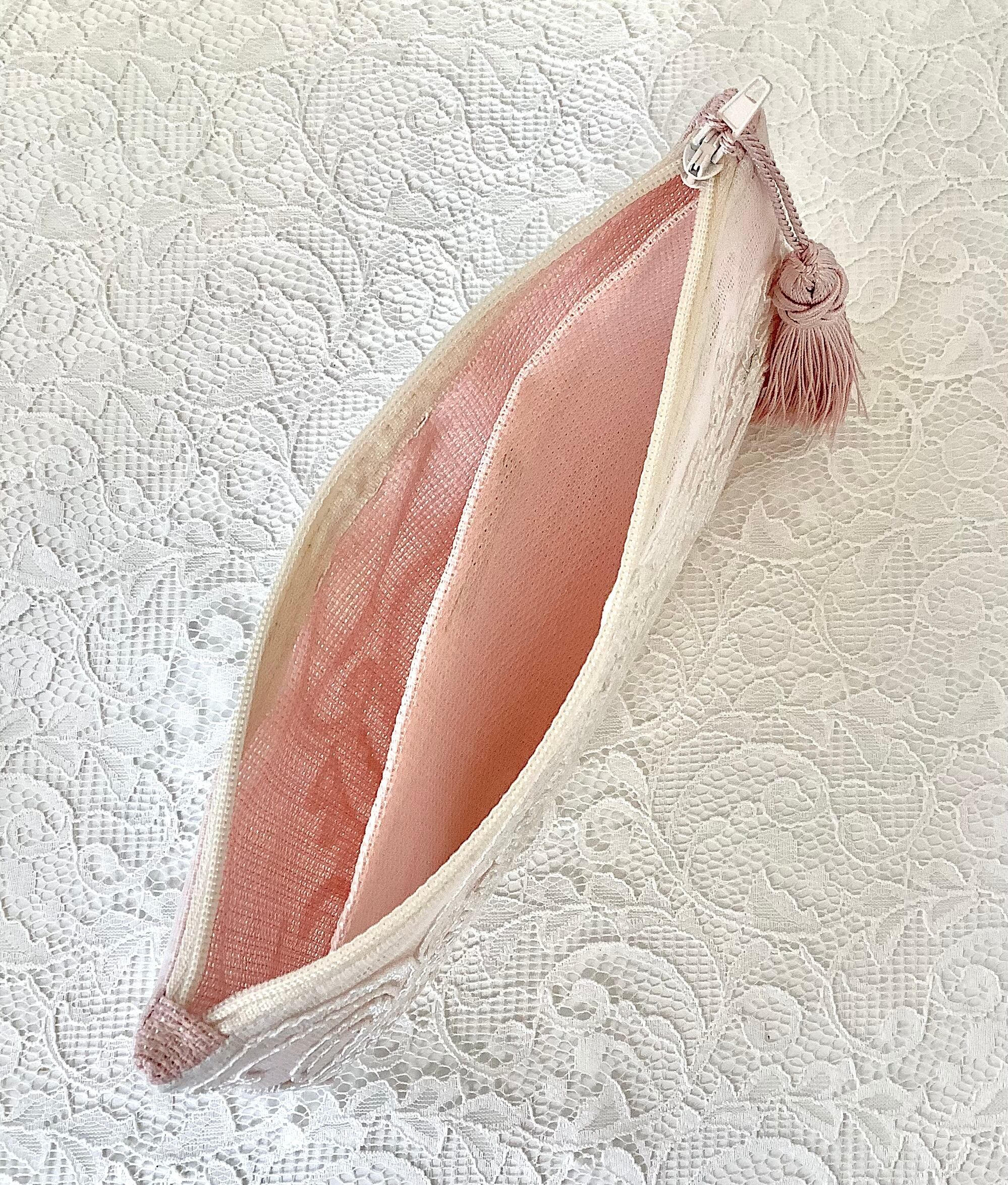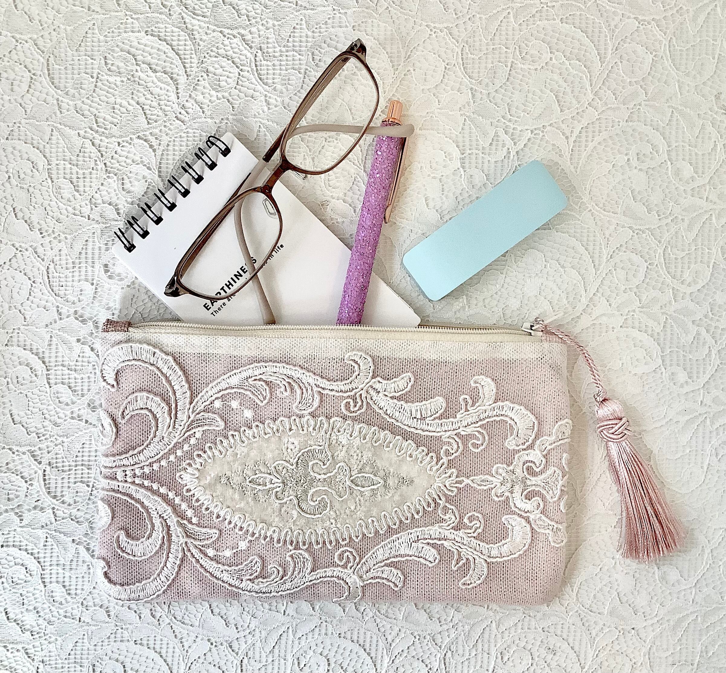 デザイン性と機能性を兼ね備えたこのポーチは、トルコの伝統的なカーテンレースを使った、アップサイクル商品です。