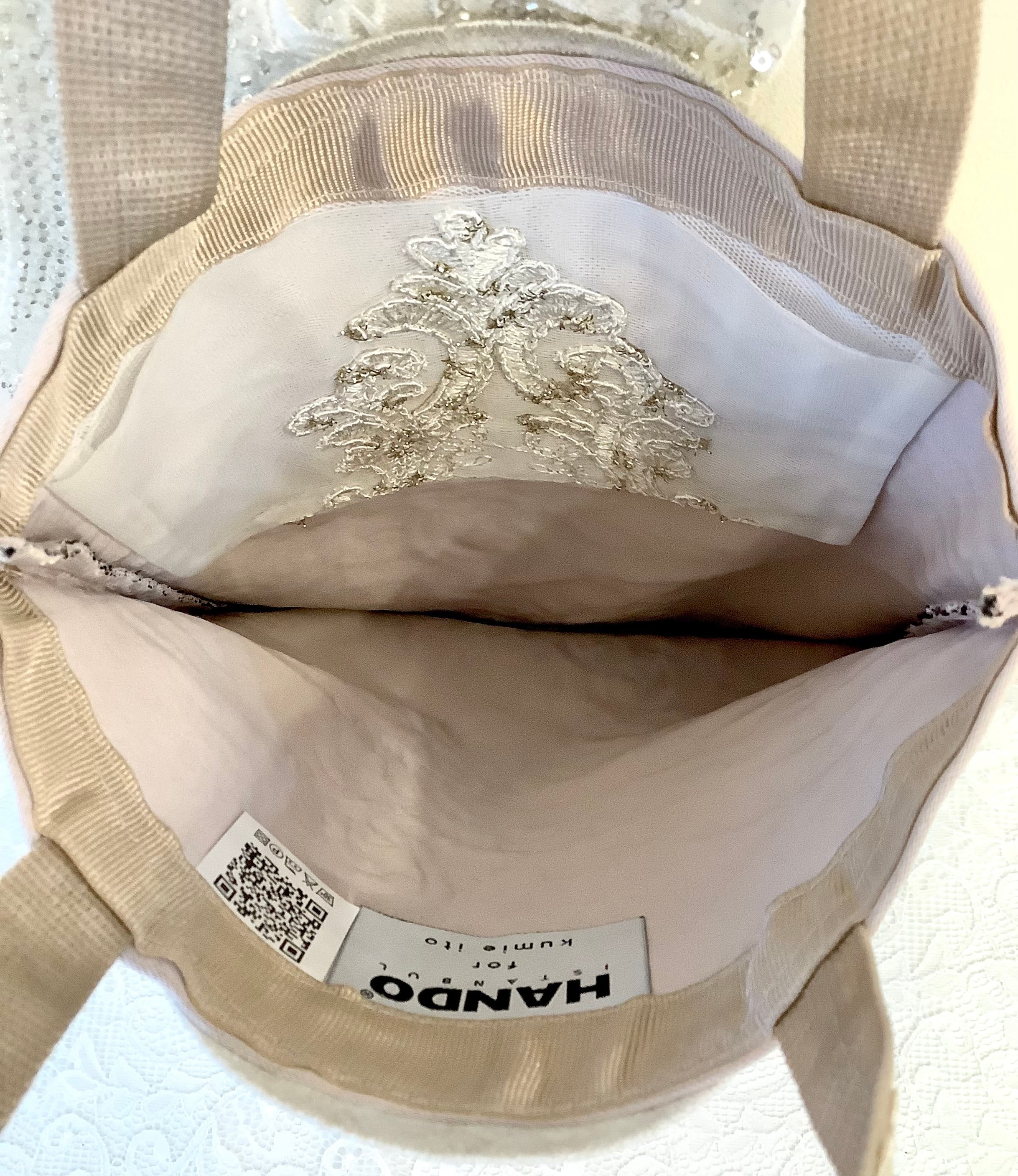 マチもあるので、かさばる羽織ものやショールなどもすっぽりおさまる。華やかなサブバッグにもおすすめです。