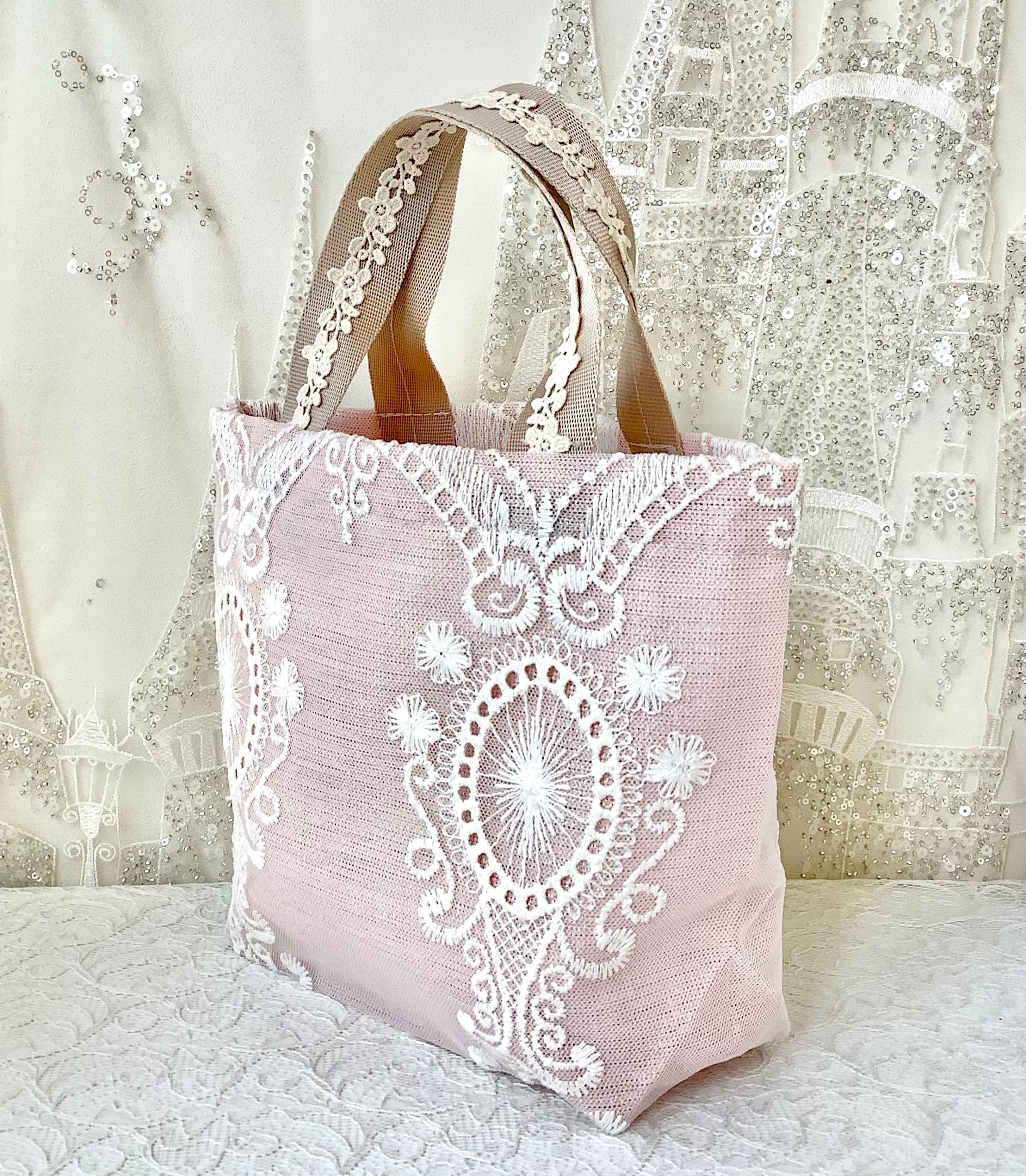 生地にレースを重ねているため、非常に丈夫で長持ちし、底マチ部分にもたっぷりとレースが使用されており、エレガントなデザインが特徴です。