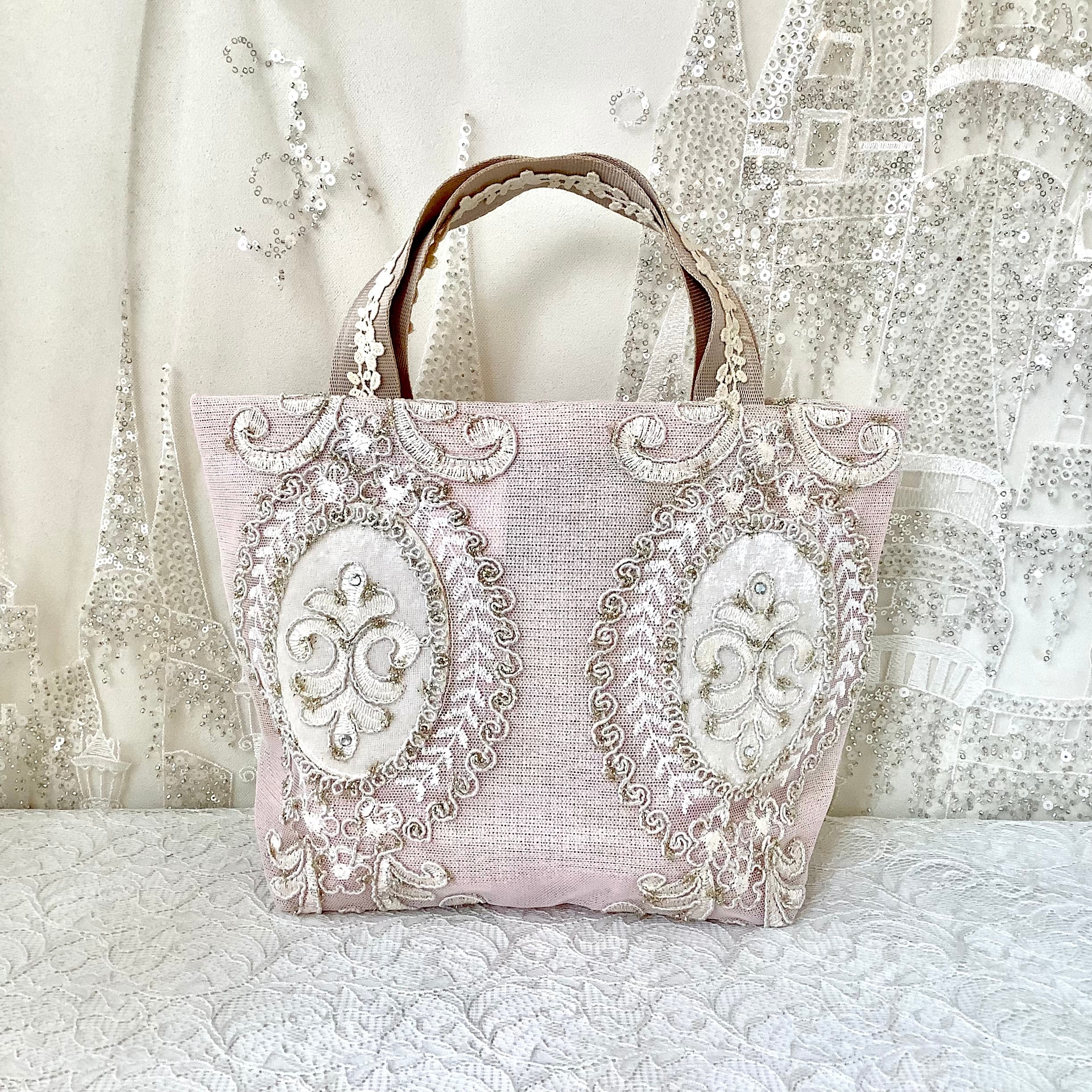 生地にレースを重ねているため、非常に丈夫で長持ちし、底マチ部分にもたっぷりとレースが使用されており、エレガントなデザインが特徴です。