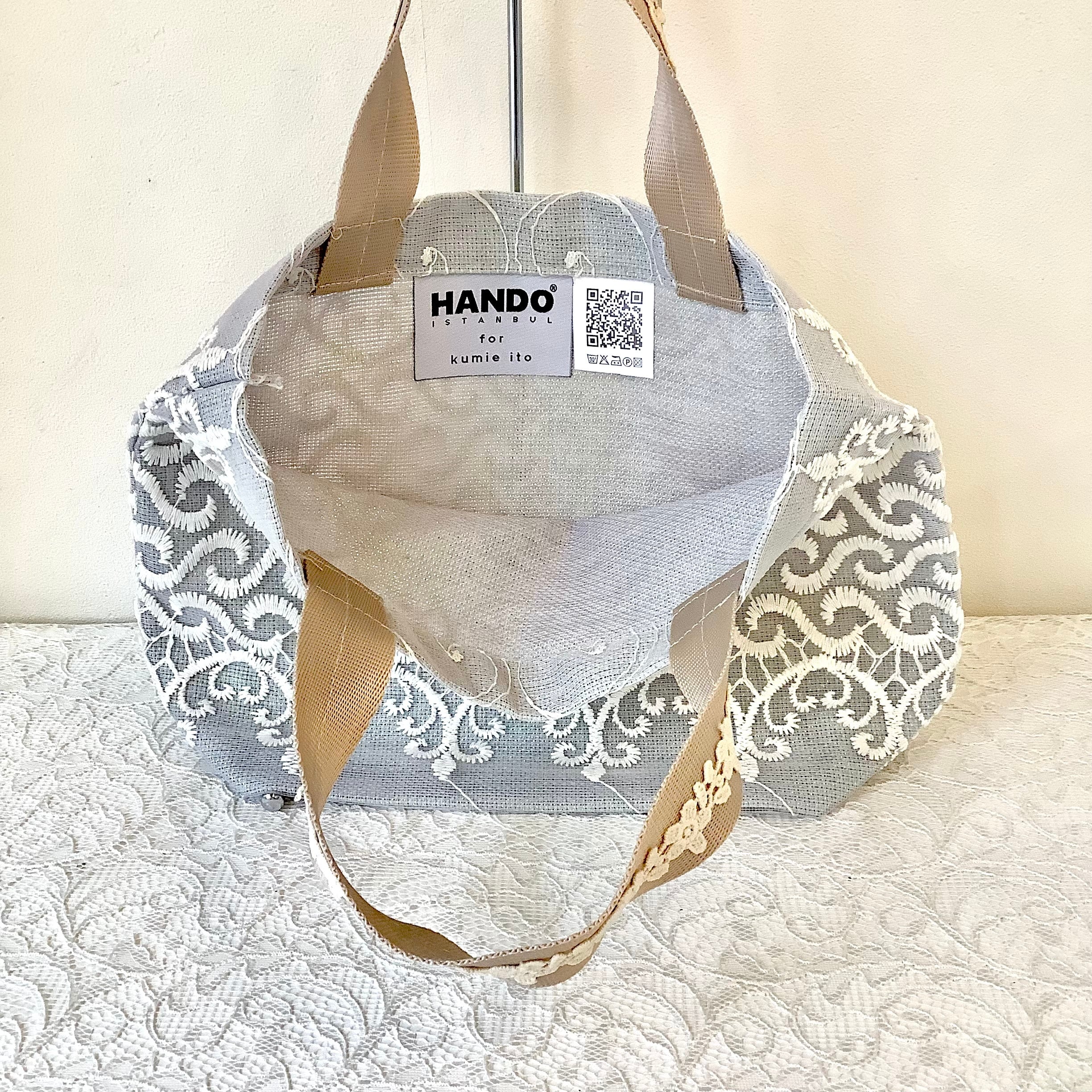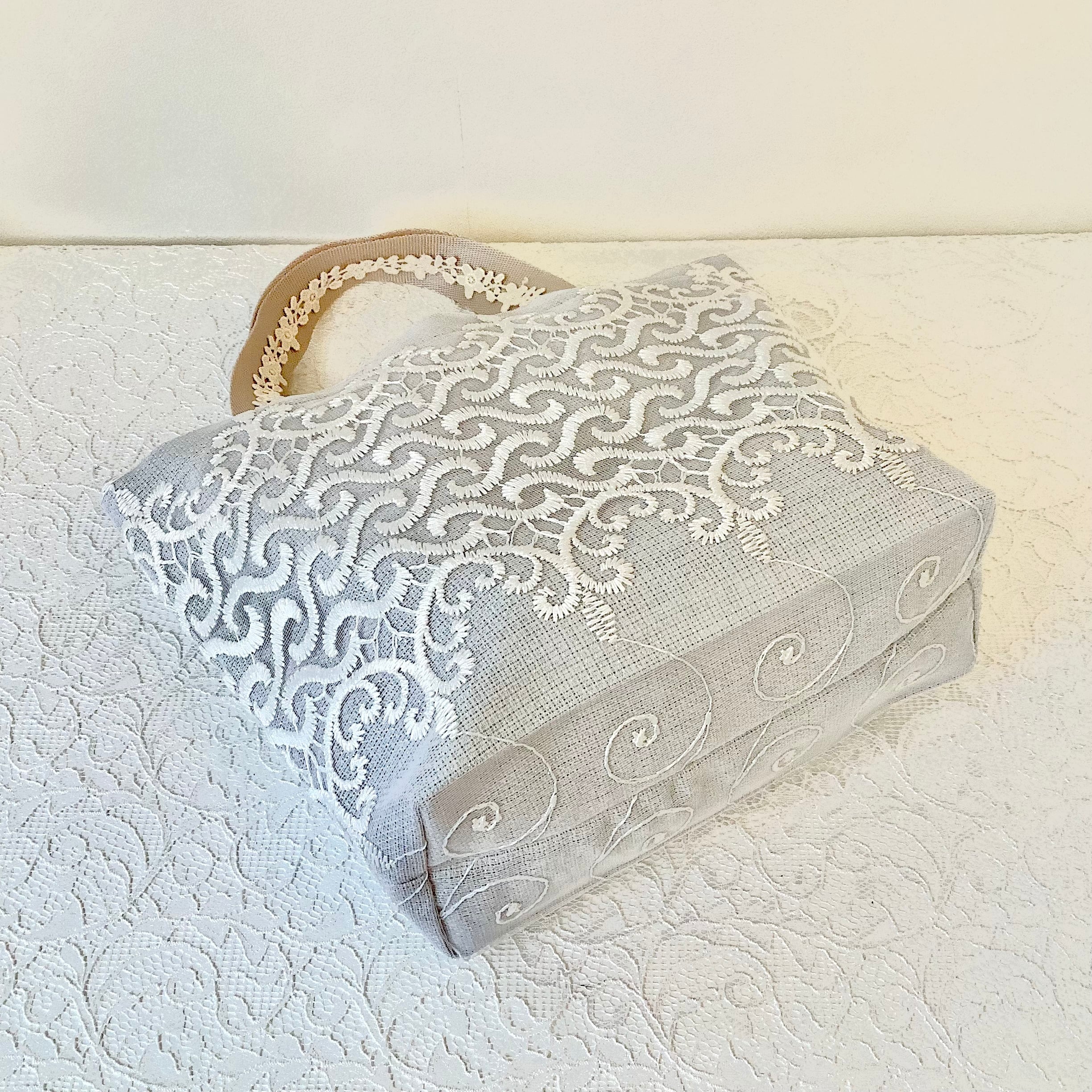 生地にレースを重ねているため、非常に丈夫で長持ちし、底マチ部分にもたっぷりとレースが使用されており、エレガントなデザインが特徴です。