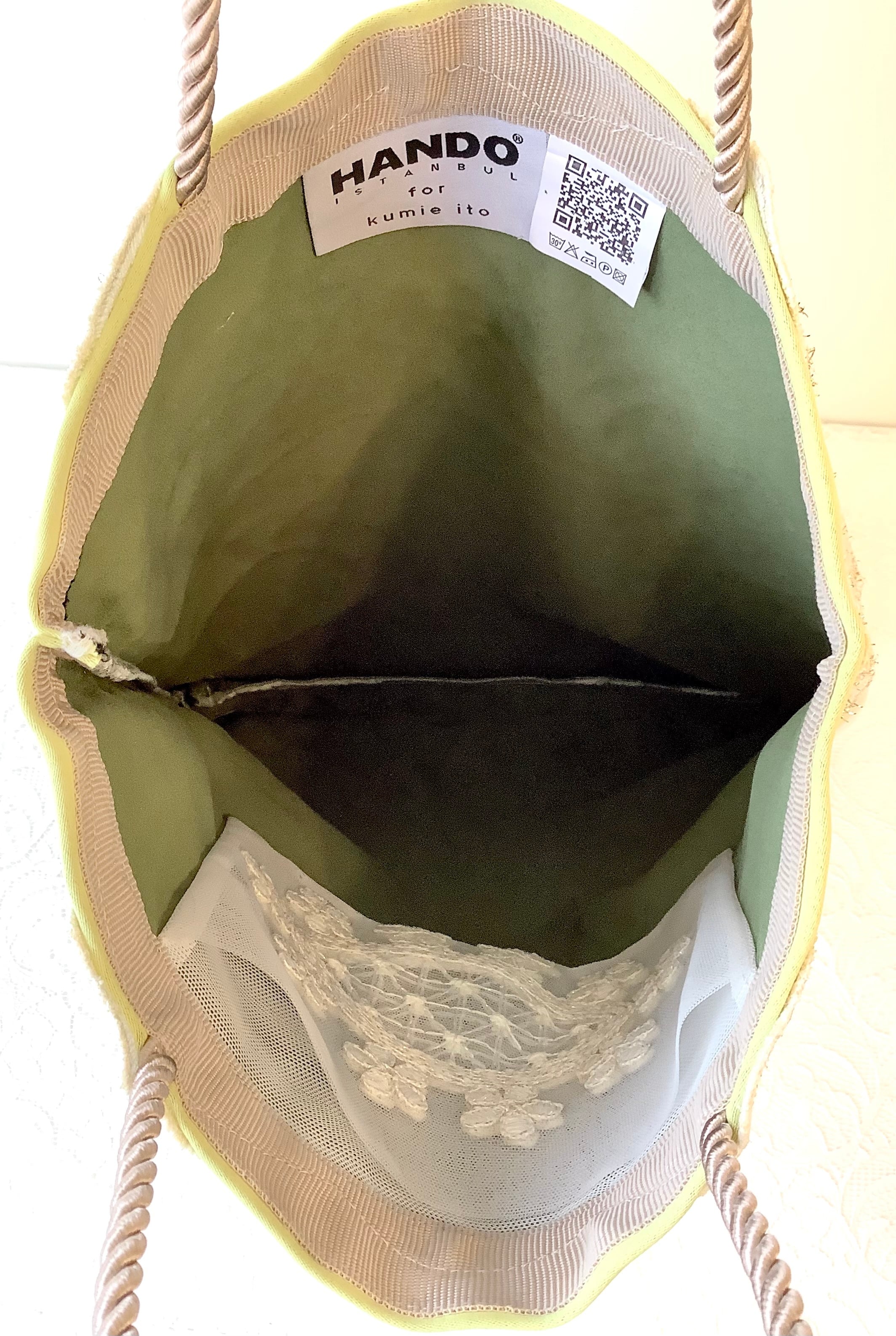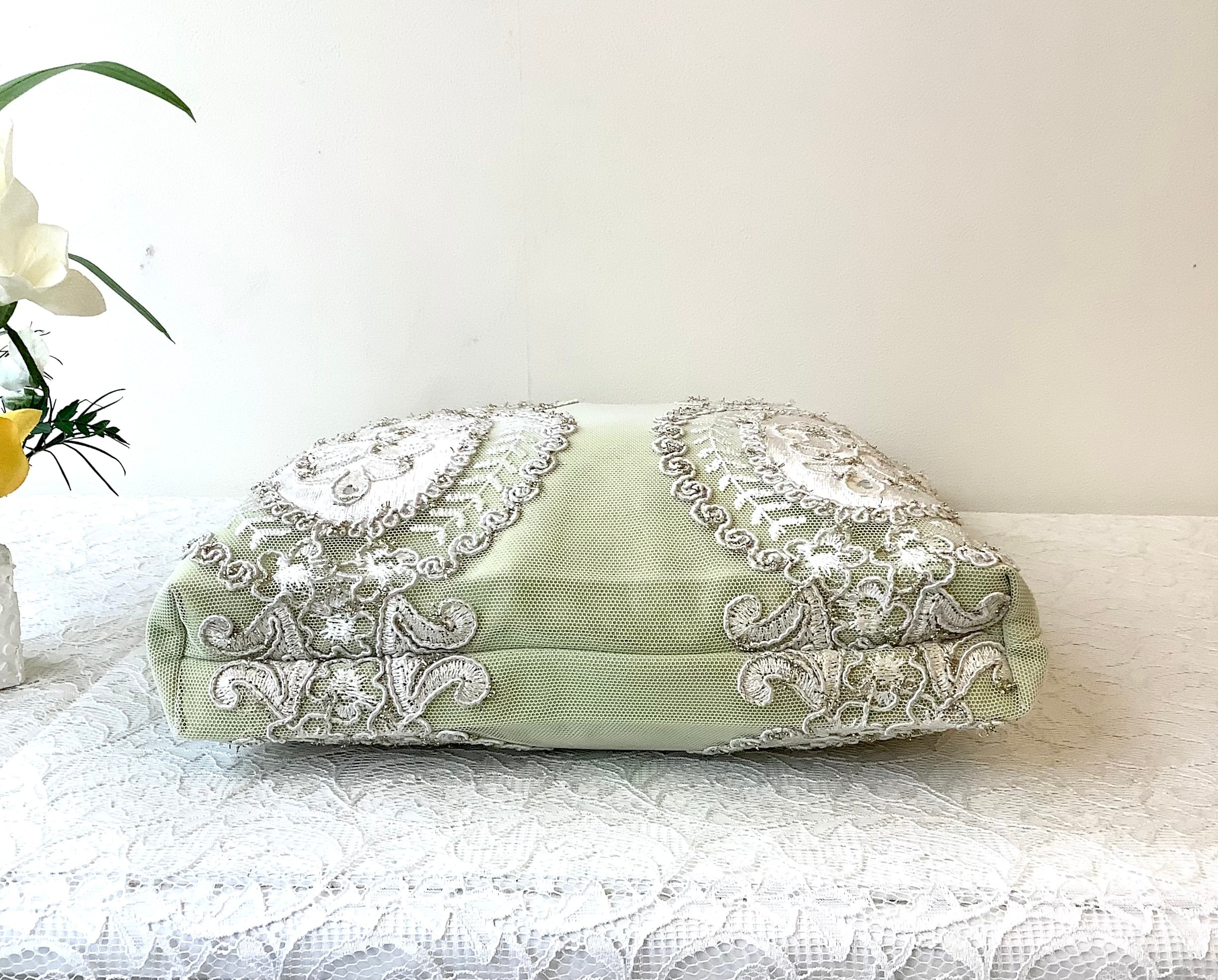内側にはレースの内ポケットもあり、マチもあるので、かさばる羽織ものやショールなどもすっぽりおさまる。華やかなサブバッグにもおすすめです。