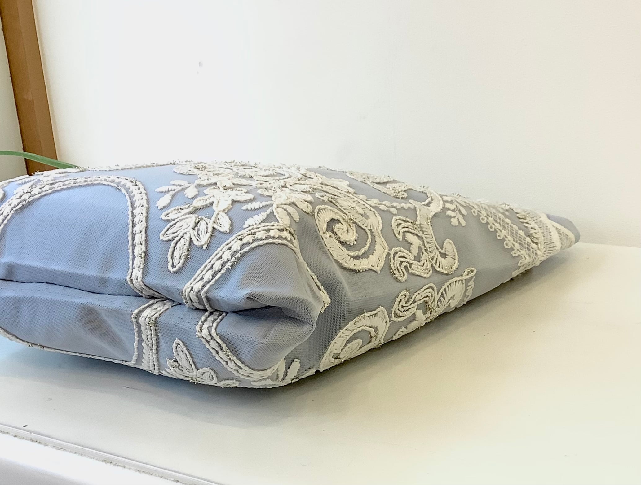 内側にはレースの内ポケットもあり、マチもあるので、かさばる羽織ものやショールなどもすっぽりおさまる。華やかなサブバッグにもおすすめです。