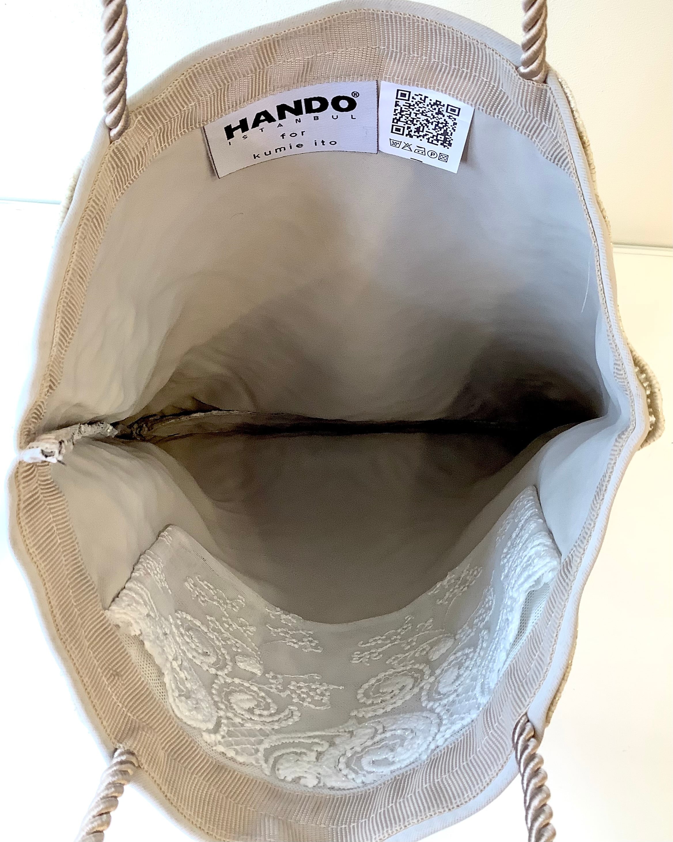 内側にはレースの内ポケットもあり、マチもあるので、かさばる羽織ものやショールなどもすっぽりおさまる。華やかなサブバッグにもおすすめです。