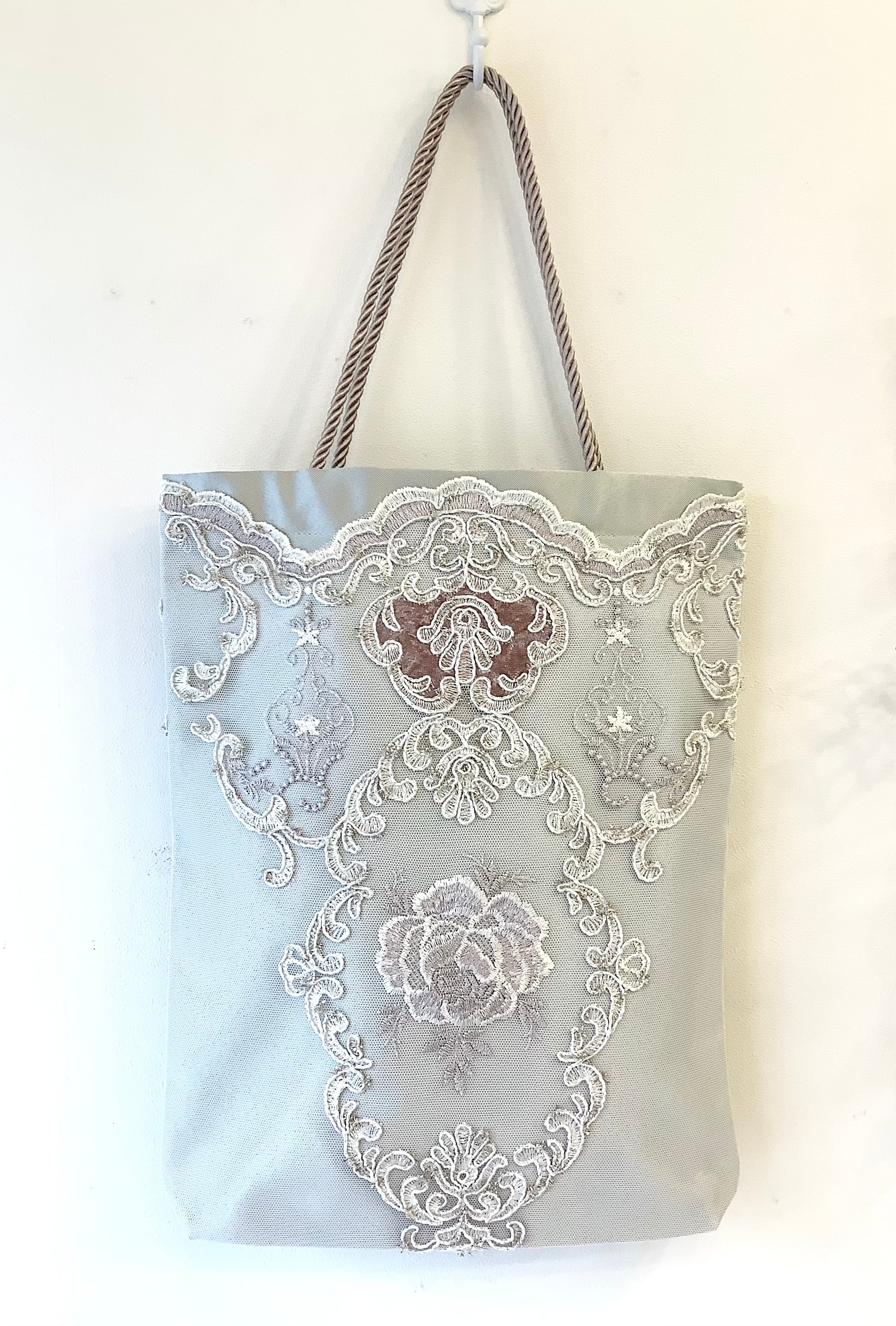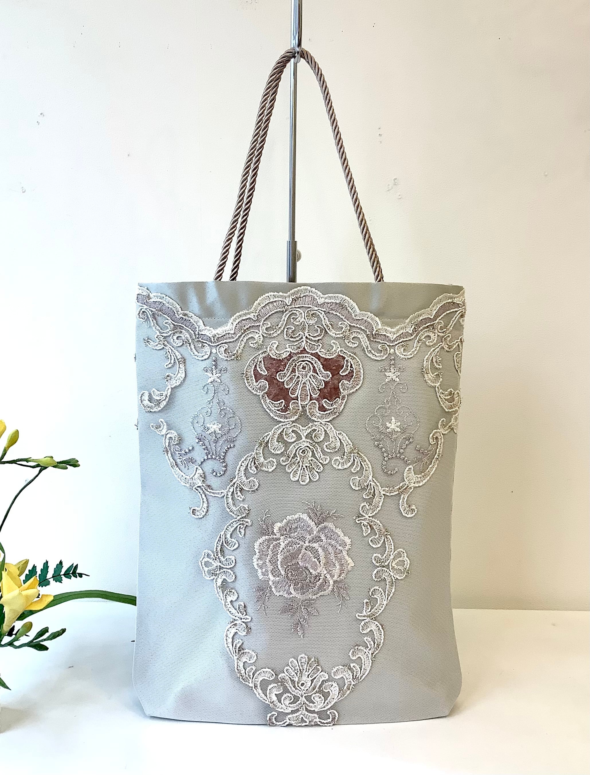 内側にはレースの内ポケットもあり、マチもあるので、かさばる羽織ものやショールなどもすっぽりおさまる。華やかなサブバッグにもおすすめです。