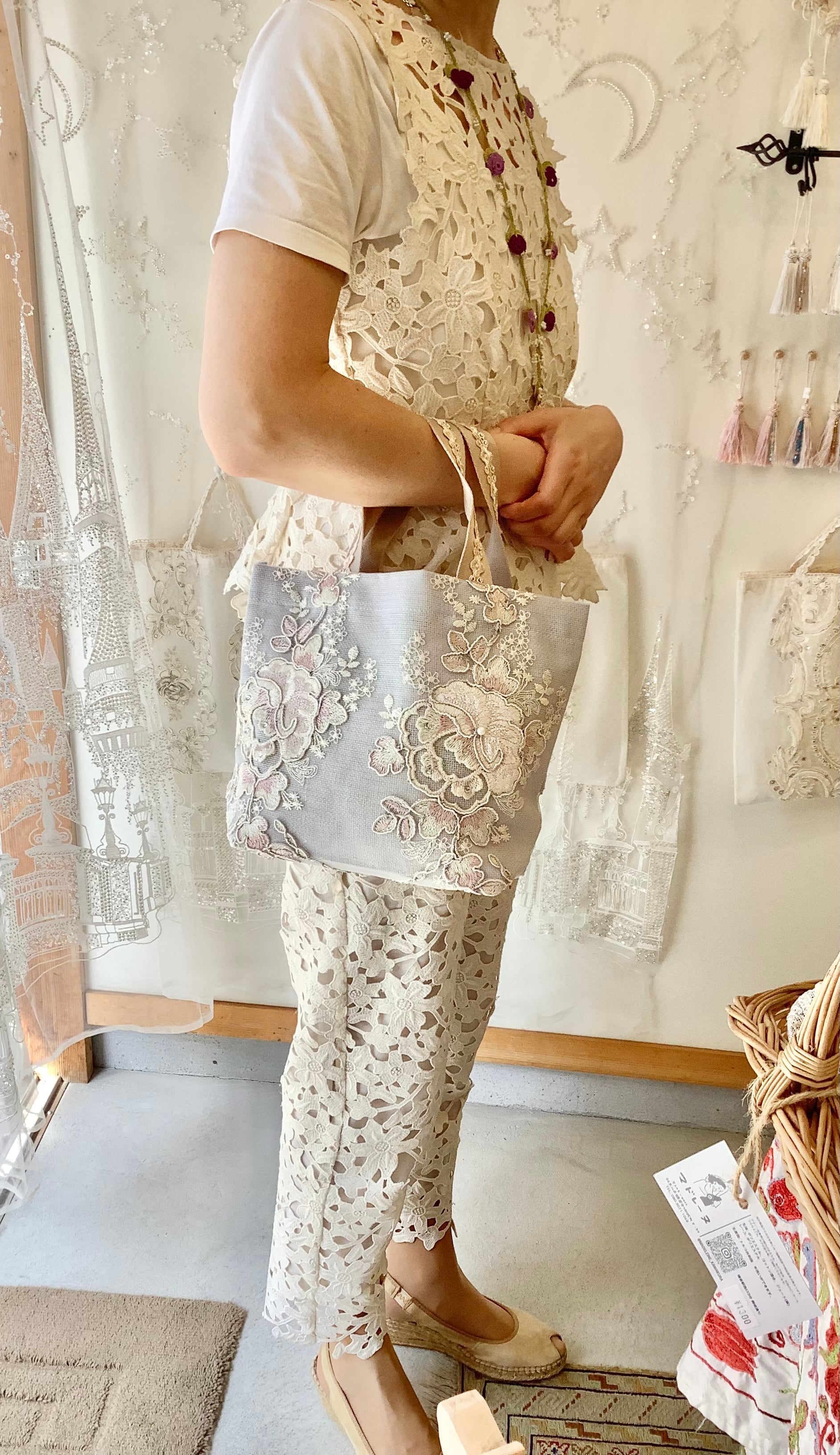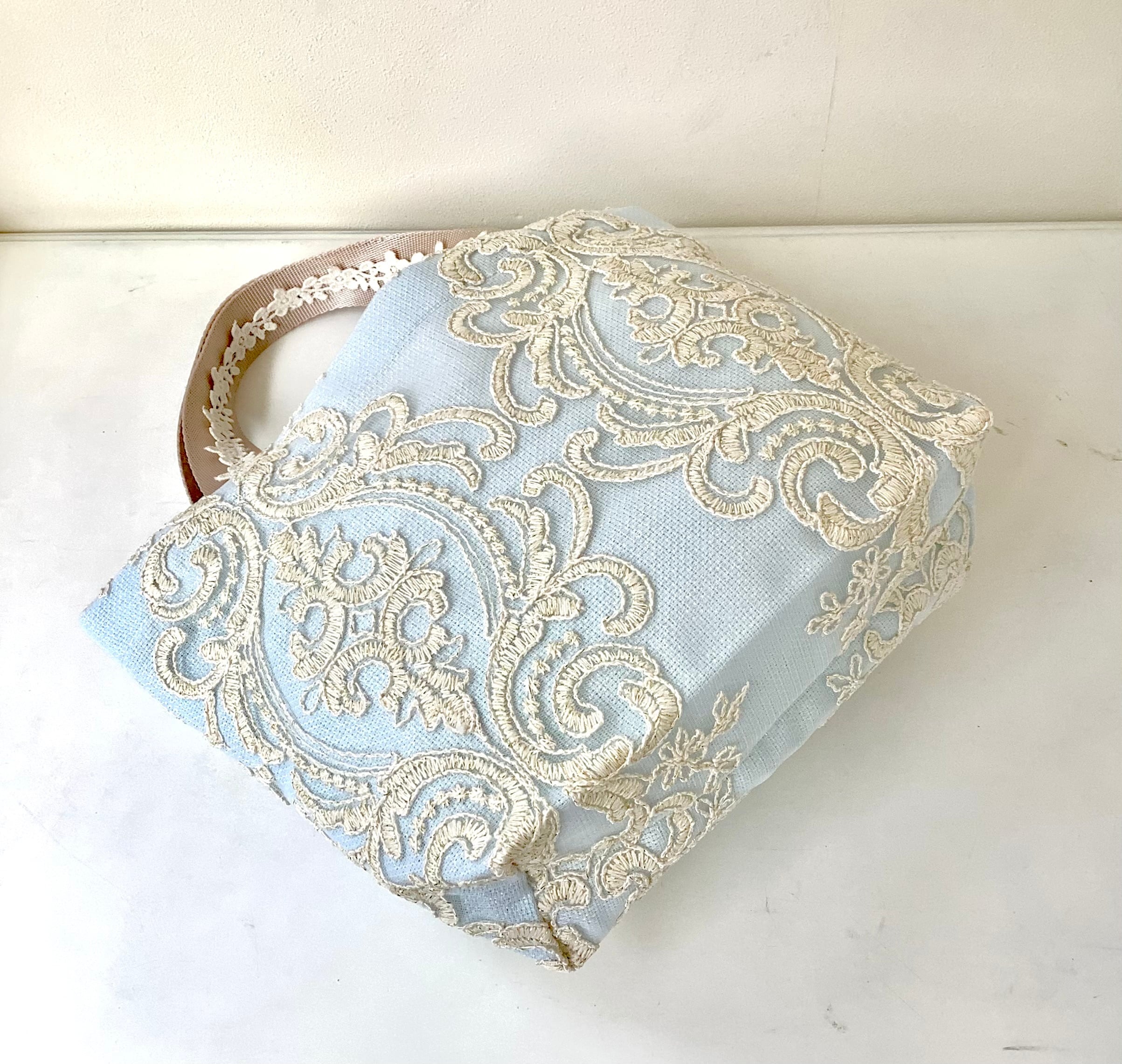 生地にレースを重ねているため、非常に丈夫で長持ちし、底マチ部分にもたっぷりとレースが使用されており、エレガントなデザインが特徴です。