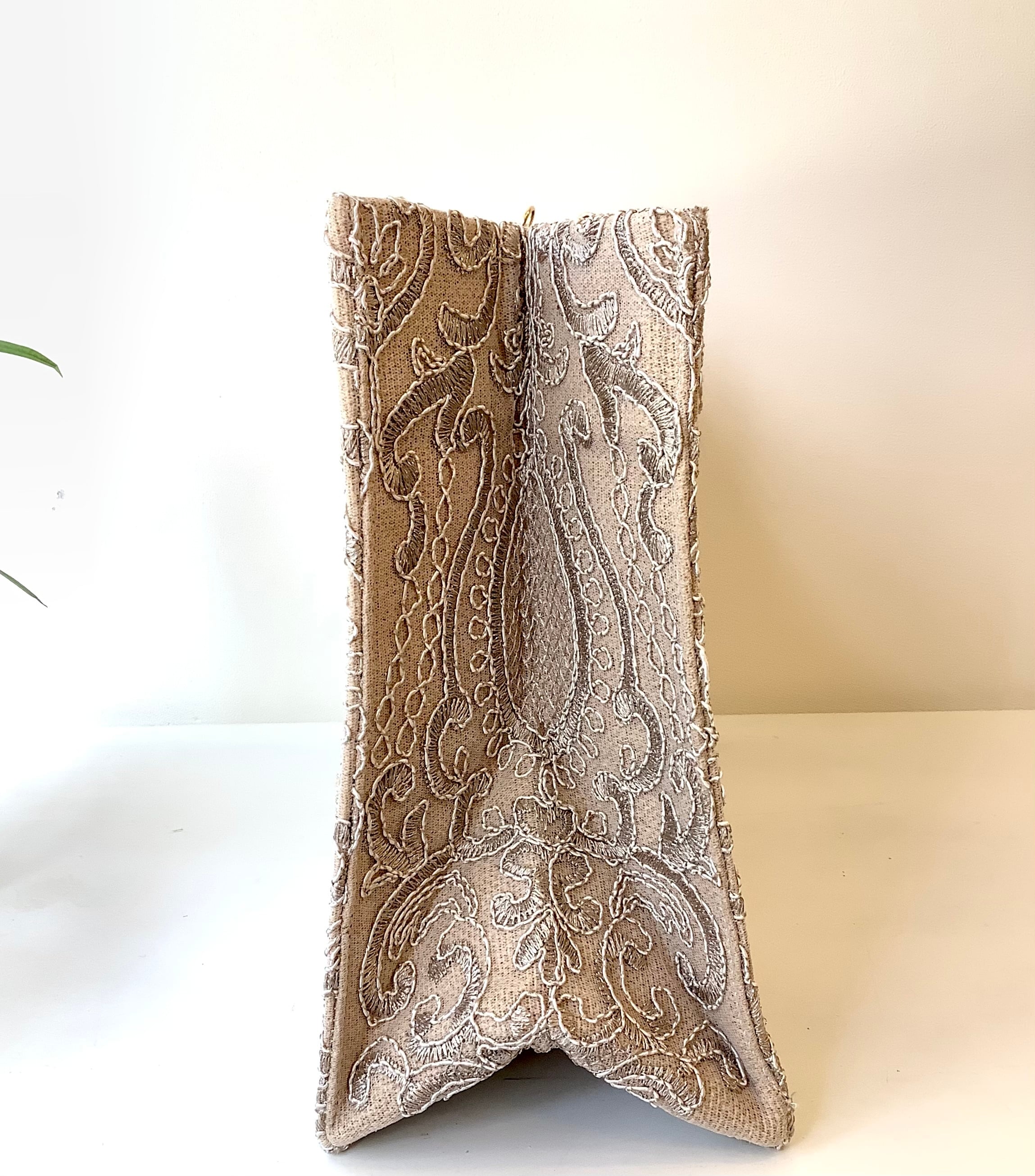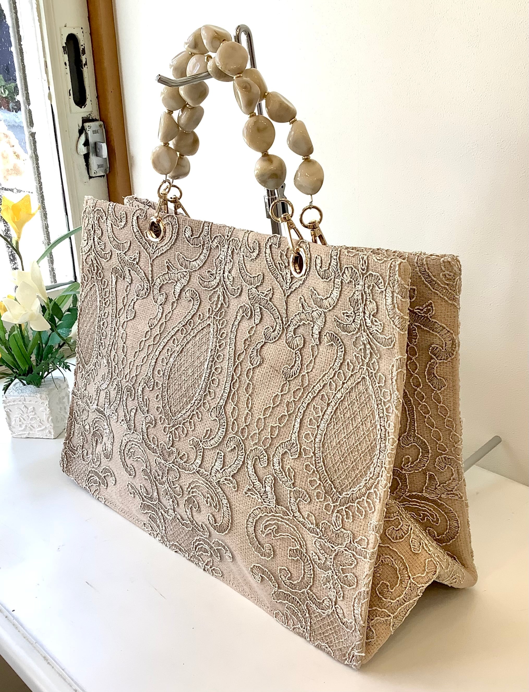 ジャンボトート "ロコ" は、ジュート素材にトルコの高級レースを重ねた、カチッとした大きめバッグです。箱型のデザインは荷物が多い人にぴったりで、パソコンを入れてもしっかり収納できます。車の移動にも便利なサイズ感で、お仕事女子にもおすすめです。エレガントなデザインは、ビジネスシーンやプライベートな習い事などでも活躍すること間違いなしです。