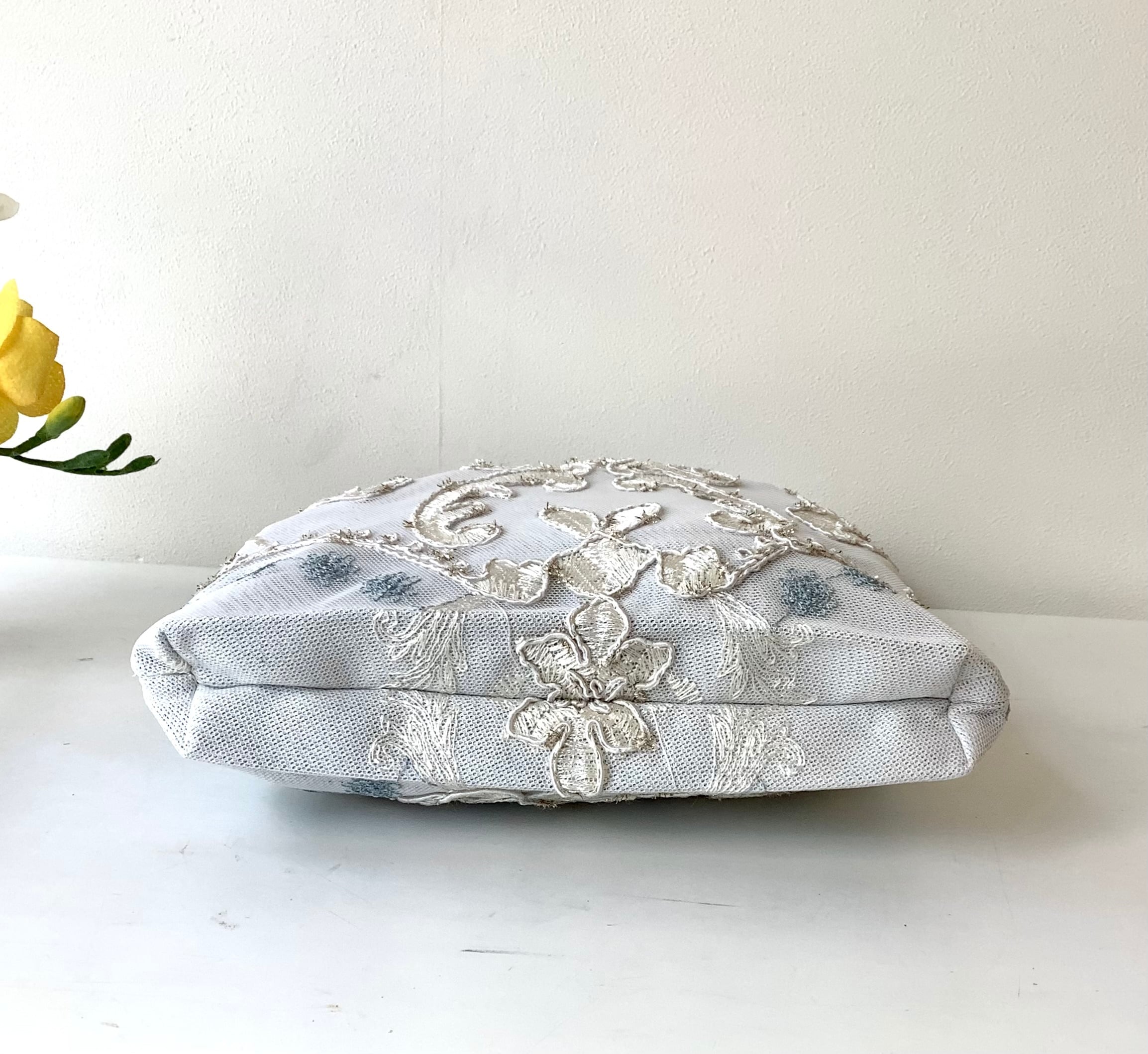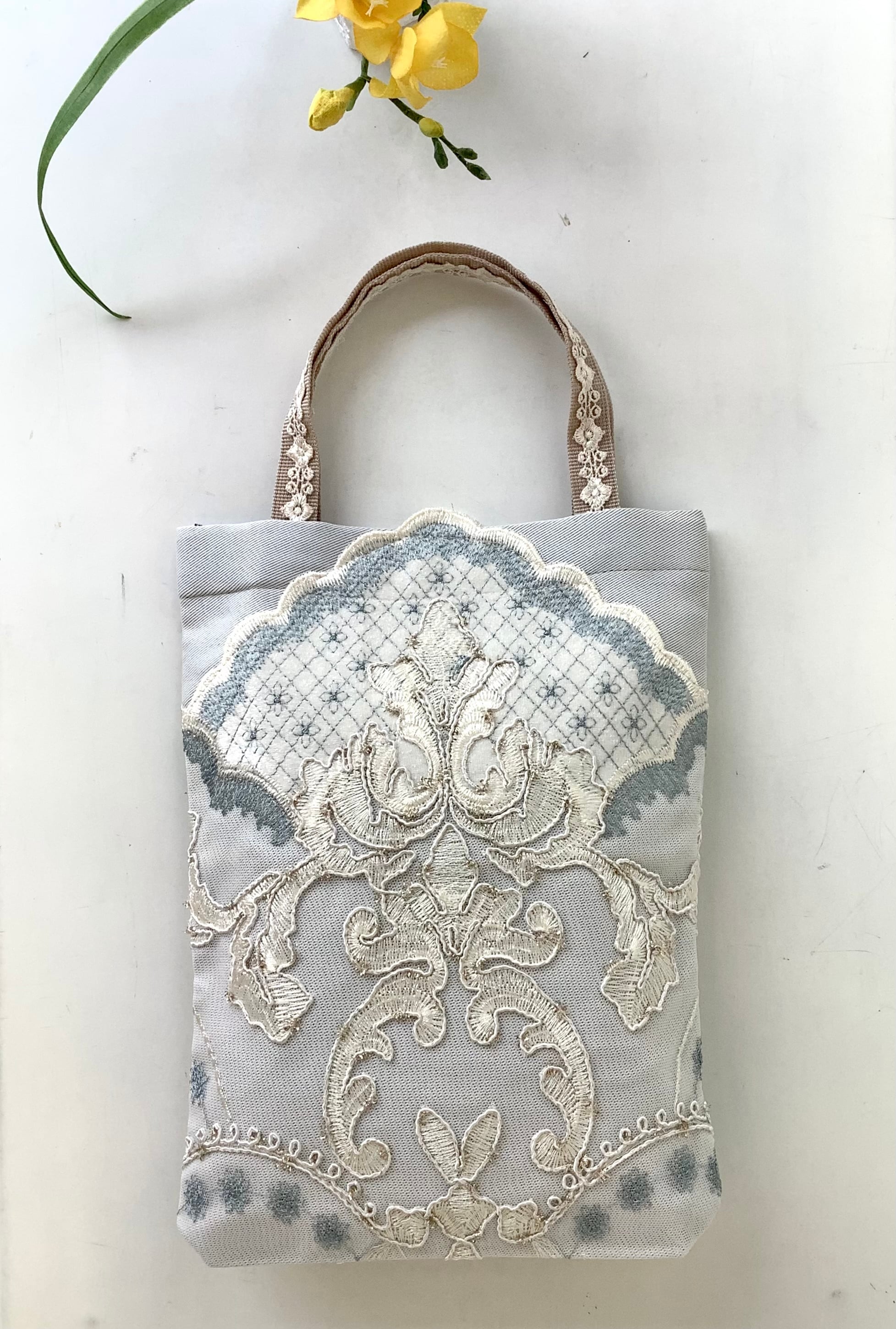 マチもあるので、かさばる羽織ものやショールなどもすっぽりおさまる。華やかなサブバッグにもおすすめです。