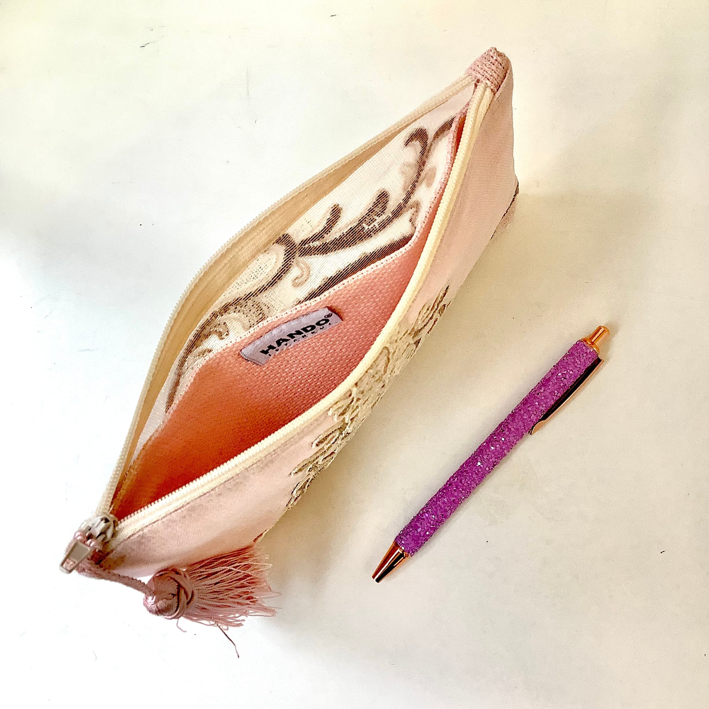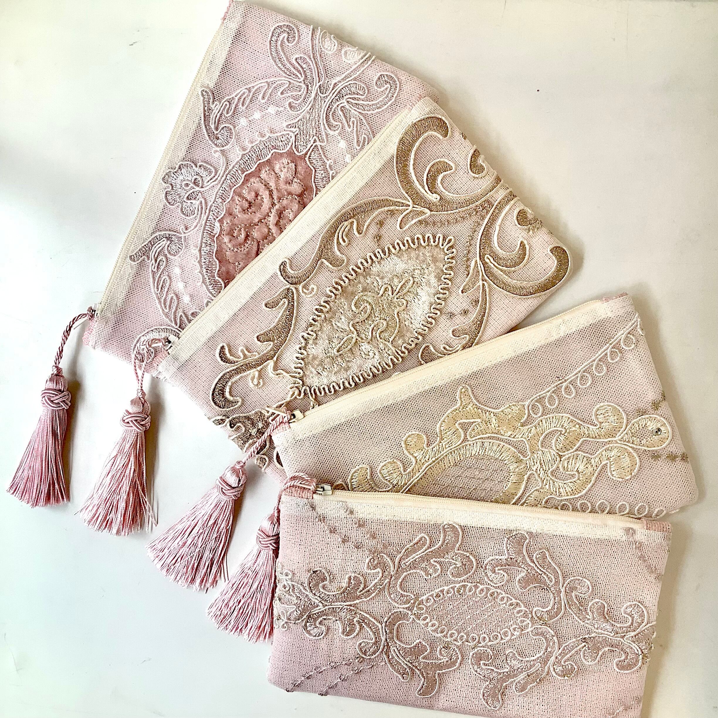デザイン性と機能性を兼ね備えたこのポーチは、トルコの伝統的なカーテンレースを使った、アップサイクル商品です。