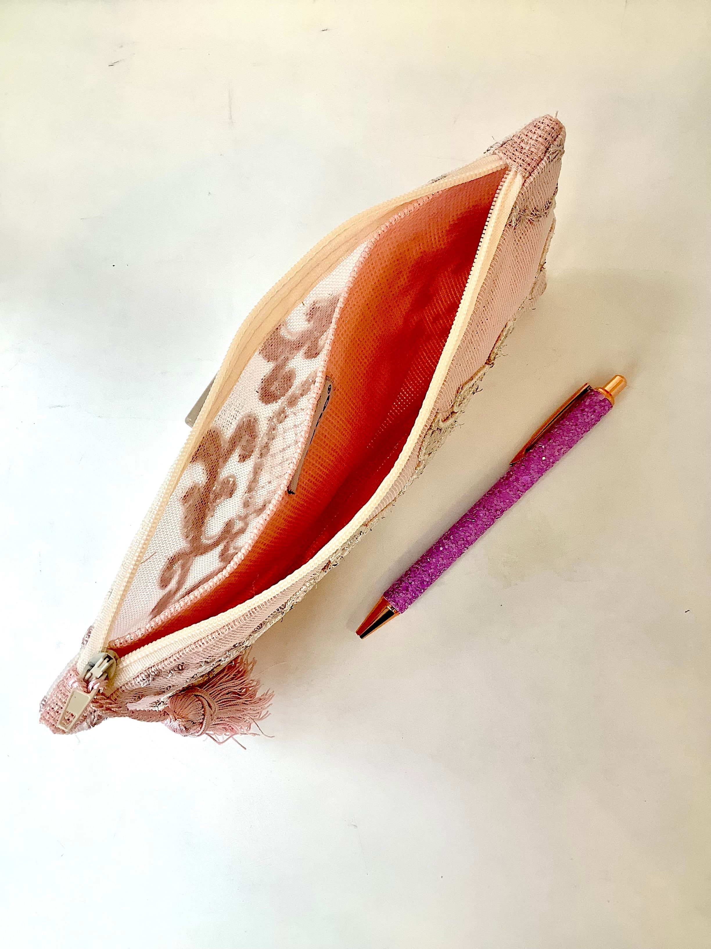 デザイン性と機能性を兼ね備えたこのポーチは、トルコの伝統的なカーテンレースを使った、アップサイクル商品です。