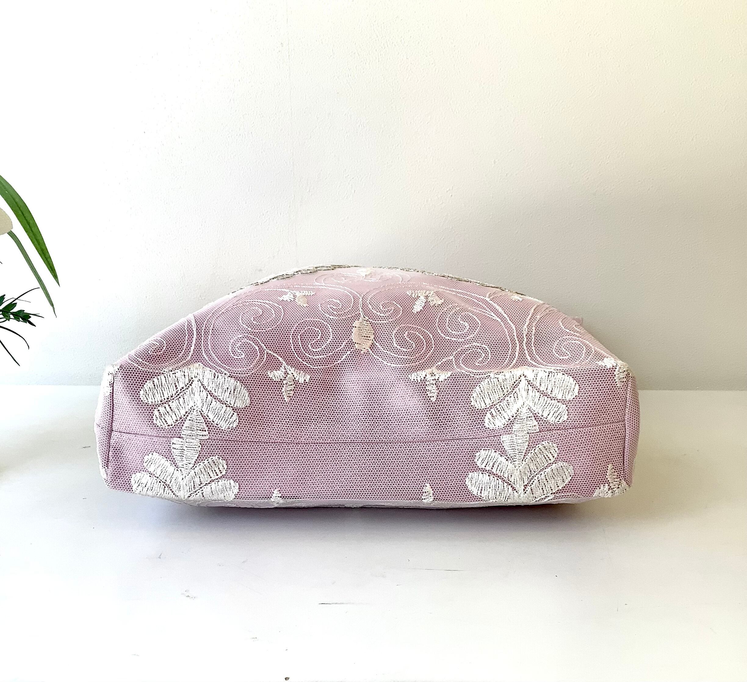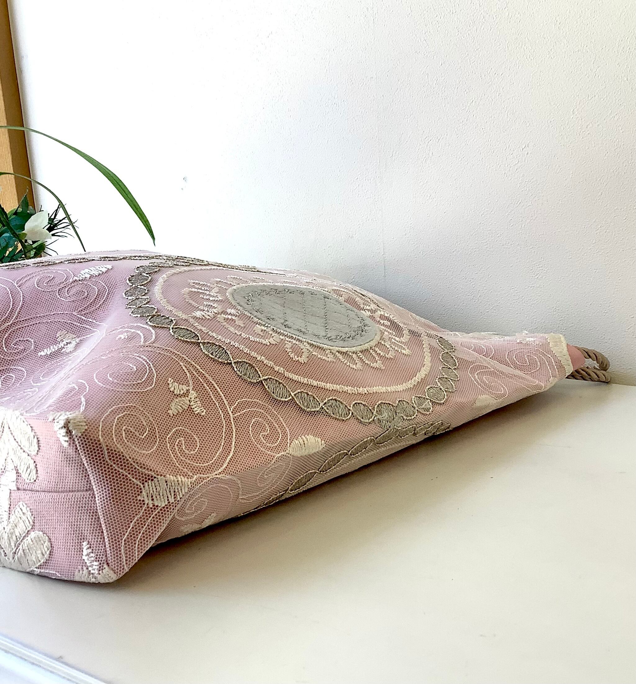 内側にはポケットはありませんが、マチもあるので、かさばる羽織ものやショールなどもすっぽりおさまる。華やかなサブバッグにもおすすめです。